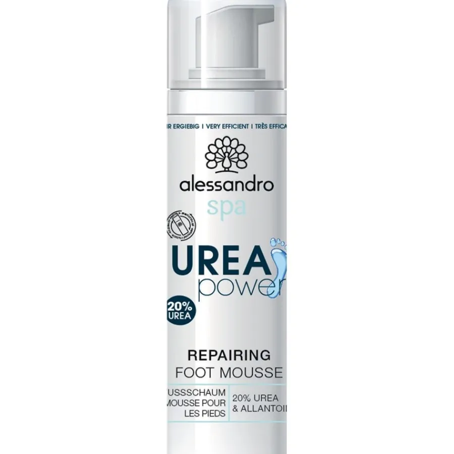 Um verhornte Hautstellen, wie sie häufig an beanspruchten Füßen auftreten, wieder weich und geschmeidig zu machen, sollte Urea in erhöhter Konzentration eingesetzt werden. Deshalb enthält die Repairing Foot Mousse 20% Urea von Alessandro mehr Urea als andere Produkte zur Hautpflege, wie beispielsweise Bodylotions. Der mit 20 % besonders hohe Gehalt an Urea sorgt für eine intensive Fußpflege, wobei die weich machende und feuchtigkeitsspendende Wirkung sofort nach dem Auftragen deutlich spürbar wird. Bei regelmäßiger Fußpflege mit der Repairing Foot Mousse 20% Urea verringern sich außerdem zunehmend verhornte Haustellen und machen die Füße, je nach Anwendungsdauer, wieder vollkommen geschmeidig. Der Inhaltsstoff Allantoin unterstützt dabei die pflegende Wirkung durch Förderung der Zellerneuerung und Regeneration der Haut. Der Fußschaum von Alessandro ist dabei angenehm auf der Haut, ohne einen störenden Fettfilm zu hinterlassen.
