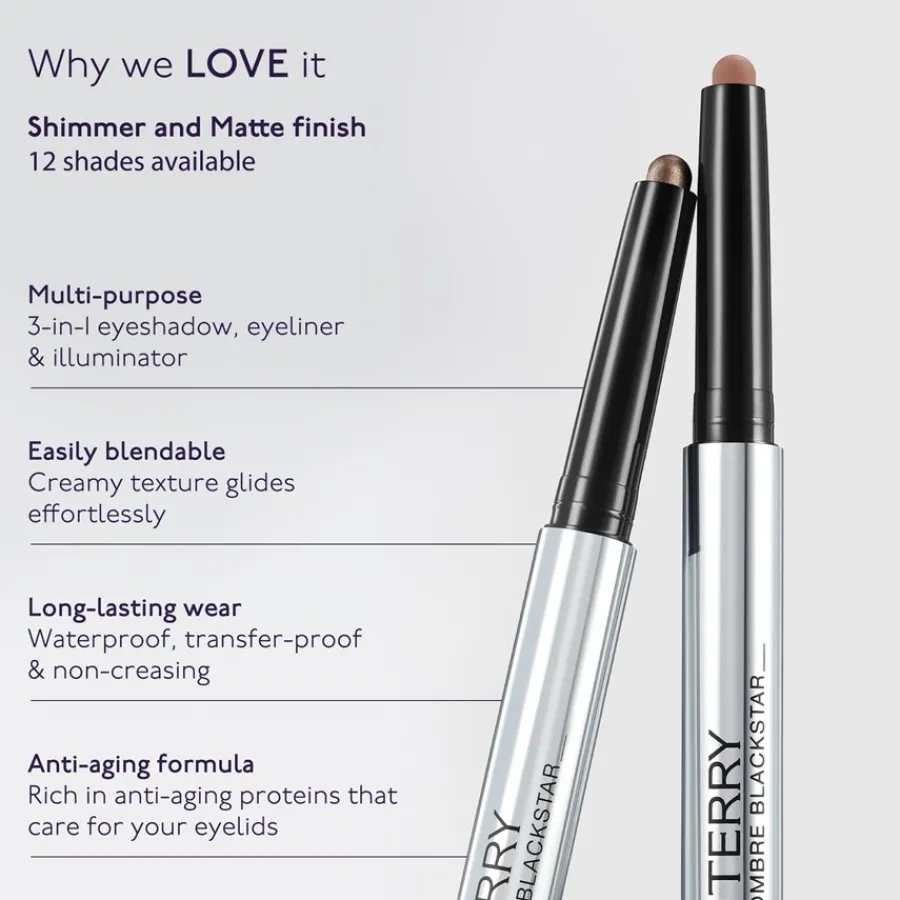 Mit dem Ombre Blackstar Eyeshadow der Marke By Terry erfahren Ihre Augenlider aufregende Akzente und geben Ihrem Make-up einen dramatischen Höhepunkt. Sanft und rauchig umschmeicheln die Farben Ihr Lid und machen jeden Augenaufschlag zu einem verführerischen Erlebnis. Lang anhaltend und mühelos auftragbar, unterstreicht dieser Lidschatten den ganzen Tag hindurch ein gepflegtes Auftreten. Bewahren Sie die Kontrolle, was auch passiert. Enthalten ist ein schmaler Stift mit geschmeidiger, präziser Spitze für den gezielten Gebrauch. Erhältlich sind die Farben Black Pearl, Blond Opal, Bronze Moon, Misty Rock, Frozen Quartz und Ombre Mercure, sodass jedes Make-up mit diesem hochwertigen Lidschatten gekrönt werden kann.