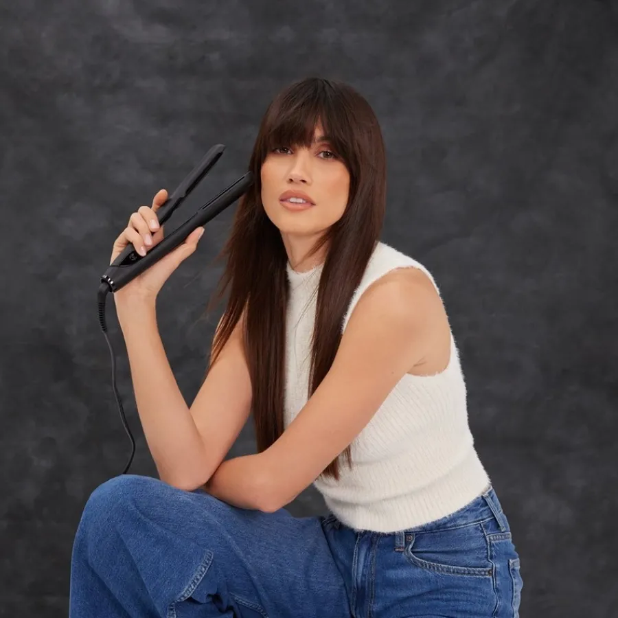 Schritt 5: Führen Sie das breite Glätteisen von der Wurzel bis zu den Spitzen durch jede Haarpartie. Unsere Platten sind sind mit Mineralien angereichert, die wahre Wunder bewirken. Sericit und Turmalin helfen, die Schuppenschicht zu versiegeln und Feuchtigkeit einzuschließen und das Haar glänzender zu machen. Die breitere Platte ist für ein schonenderes Styling für dickeres, längeres Haar Haar.