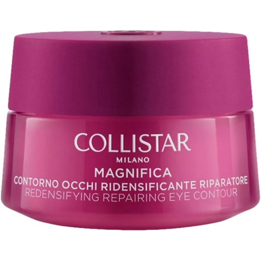 Die Magnifica Plus Redensifying & Repairing Eye Contour Cream von Collistar hellt die Augenpartie auf und glättet feine Linien, Fältchen und Mimikfalten. Dunkle Augenringe, Schwellungen und Müdigkeitserscheinungen lindert sie sofort. Sie hydratisiert die Haut, erneuert die Hautdichte und bietet zuverlässigen Schutz vor schädlichen Einflüssen. Ihre Formel eignet sich für alle Hauttypen, besonders für reife und empfindliche Haut. Klopfen Sie die Creme leicht in die Haut rund um die Augen ein, bis sie komplett eingezogen ist. Erleben Sie eine strahlende, jugendlich frische Augenpartie!