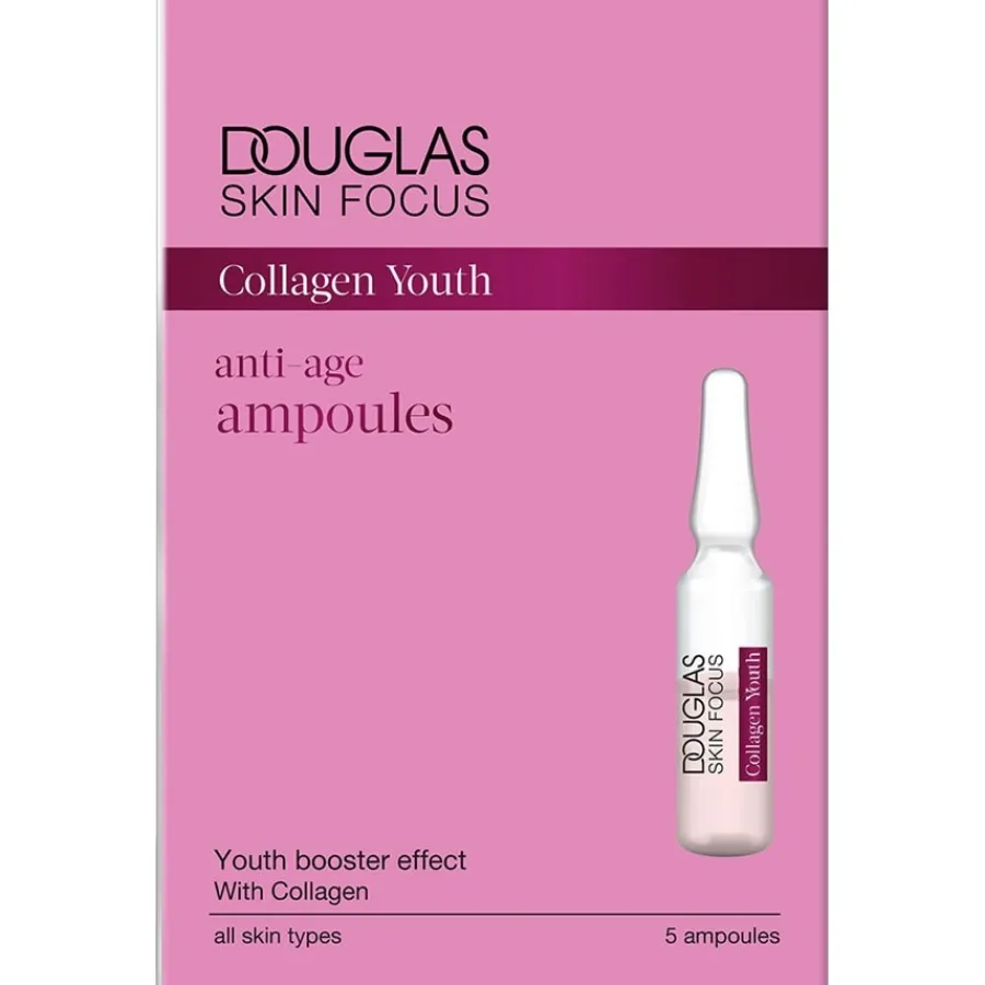 Die Collagen Youth Anti-Age Ampoules von Douglas Collection bekämpfen erste Anzeichen der Hautalterung wie feine Linien und Fältchen und straffen die Haut. Sie führen der Haut tiefenwirksam und lang anhaltend Feuchtigkeit zu, revitalisieren sie und verbessern ihre Elastizität. Ihre Formel ist für alle Hauttypen geeignet. Sie ist frei von Sulfaten, Silikonen und öligen Inhaltsstoffen. Geben Sie den Inhalt einer Ampulle in die Handflächen und verteilen Sie das Serum auf Gesicht und Hals. Nach 2 Minuten Einwirkzeit entfernen Sie Reste mit einem Wattepad. Erleben Sie glatte, pralle und jugendlich frische Haut!