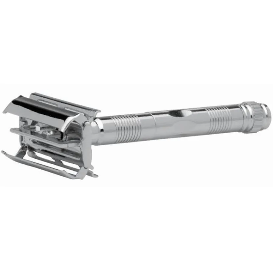 Der metallisch glänzende Rasierer von Becker Manicure bringt gleich zwei Klingen mit sich. Ist die eine Seite stumpf und es fehlt an Ersatz, stehen Sie nicht unverrichteter Dinge im Bad – Sie nehmen einfach die zweite Seite. Clever in der Anwendung und sicher in der Hand – das ist das Merkmal zweischneidiger Rasierer aus der Reihe Shaving Shop.