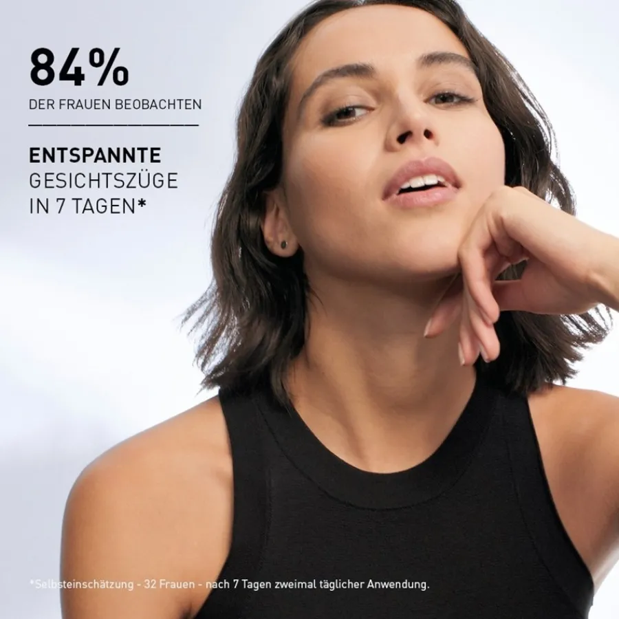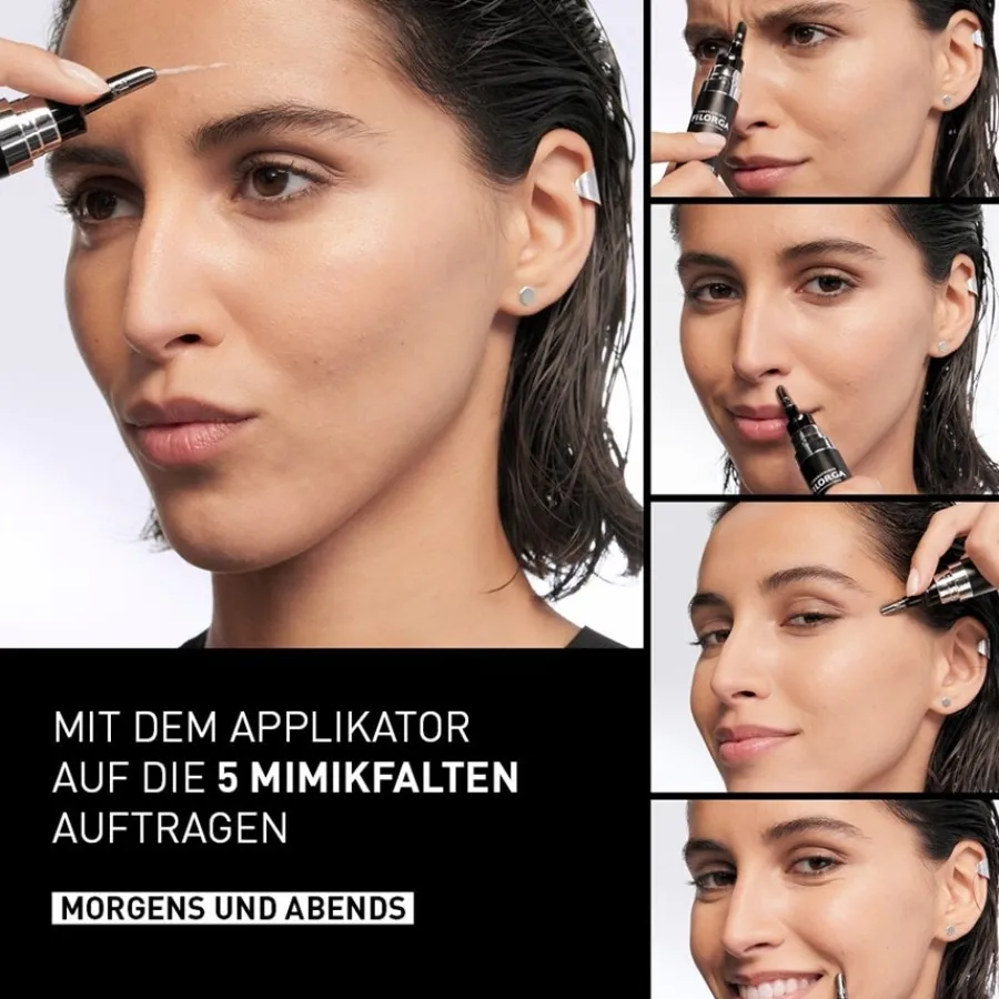 Das Hautpflege-Serum ist für die tägliche Anwendung morgens und abends gedacht. Nach der Gesichtsreinigung tragen Sie eine angemessene Menge des Produkts direkt mit dem Applikator auf die Mimikfalten auf. Anschließend massieren Sie die weiße Geltextur sanft in die Haut ein. Die Formel zieht rasch ein und hinterlässt ein leichtes Finish. Danach sollten Sie eine geeignete Tages- oder Nachtcreme auftragen.