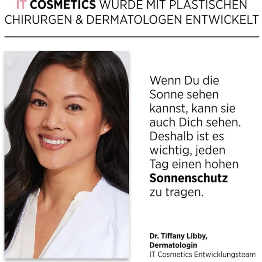 Die Your Skin But Better CC+ Cream SPF 50+ von it Cosmetics deckt Hautunregelmäßigkeiten zuverlässig ab und verwöhnt die Haut gleichzeitig mit wertvoller Pflege. Sie hydratisiert die Haut, schützt sie vor sonnenbedingten Schäden, mildert die Faltentiefe und reduziert die Sichtbarkeit von Poren. Ihre Formel ist frei von Parabenen, Paraffinen und Mikroplastik. Tragen Sie die Textur mit kreisenden Bewegungen auf Ihr Gesicht auf, um ein gleichmäßiges Finish zu erzielen. Genießen Sie einen glatten, ebenmäßigen Teint und ein atemberaubendes Make-up!