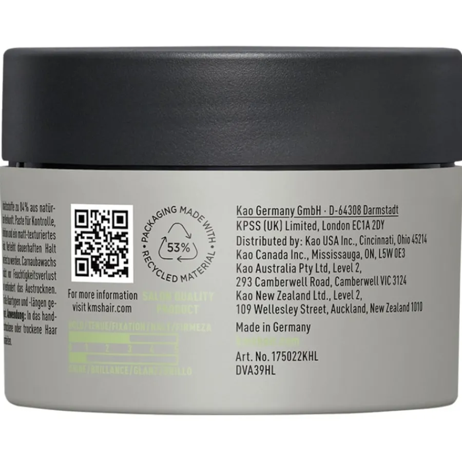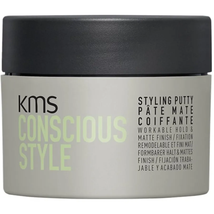 Bei KMS legt man großen Wert auf Nachhaltigkeit. Deshalb liegt der Conscious Style Styling Putty eine Wirkstoffformel zugrunde, die mit einem Minimum an Inhaltsstoffen und einem Maximum an Wirkung punktet. So enthält die Paste das natürliche Styling-Polymer Hydrolyzed Corn Starch, dass dem Haar lang anhaltenden Halt ohne Verkleben verleiht und vor Feuchtigkeit schützt. Natürliches Carnaubawachs sorgt für Halt und Struktur und bewahrt die Haare vor dem Austrocknen, indem es Feuchtigkeit einschließt. Hydriertes Pflanzenöl fungiert als natürlicher Weichmacher und verleiht dem Haar Geschmeidigkeit. Antioxidatives Moringasamenöl versorgt das Haar mit Feuchtigkeit und schützt es vor schädlichen Umwelteinflüssen, während schonendes und beruhigendes Haferöl den Erhalt des natürlichen Gleichgewichts der Kopfhaut unterstützt.