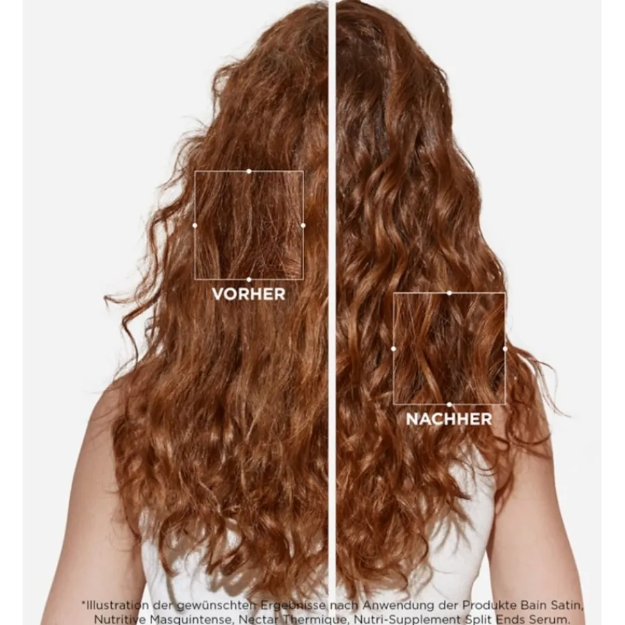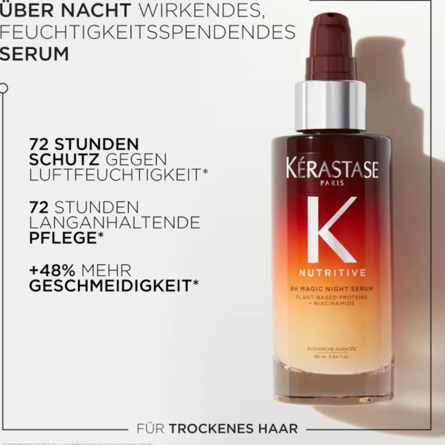 Das Nutritive 8H Magic Night Serum von Kérastase spendet den Haaren über Nacht bis in die Tiefe Feuchtigkeit und revitalisiert sie. Es baut die Haarfaser wieder auf, entwirrt sie und regeneriert sie. Seine leichte Textur zieht über Nacht ein und sorgt am Morgen für ein geschmeidiges, schwereloses Haargefühl. Es ist die ideale Wahl für trockene und strapazierte Haare. Geben Sie 1 bis 2 Pumpstöße des Serums in die Handflächen und arbeiten es gleichmäßig in die Längen und Spitzen ein. Lassen Sie es über Nacht einwirken und erleben Sie am Morgen seidiges, geschmeidiges Haar mit gesundem Glanz!