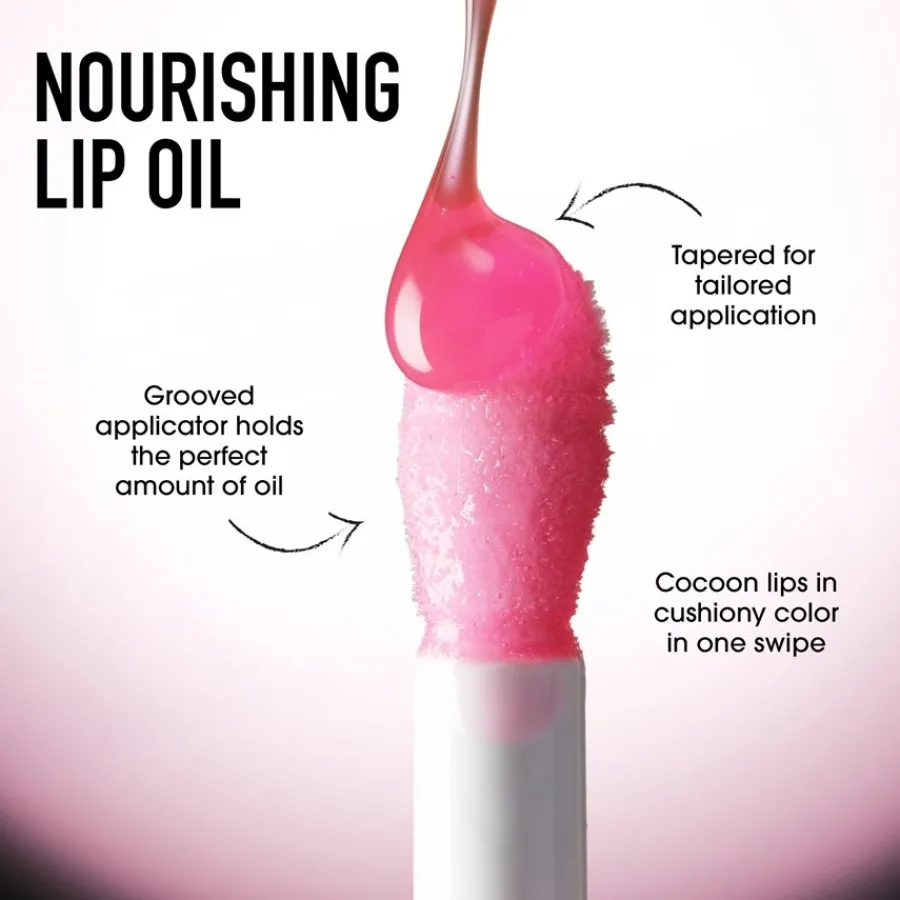 PRESSE die Lippen zusammen, um die feuchtigkeitsspendenden, glättenden Öle für einen mühelosen, pflegeleichten Glanz zu versiegeln.