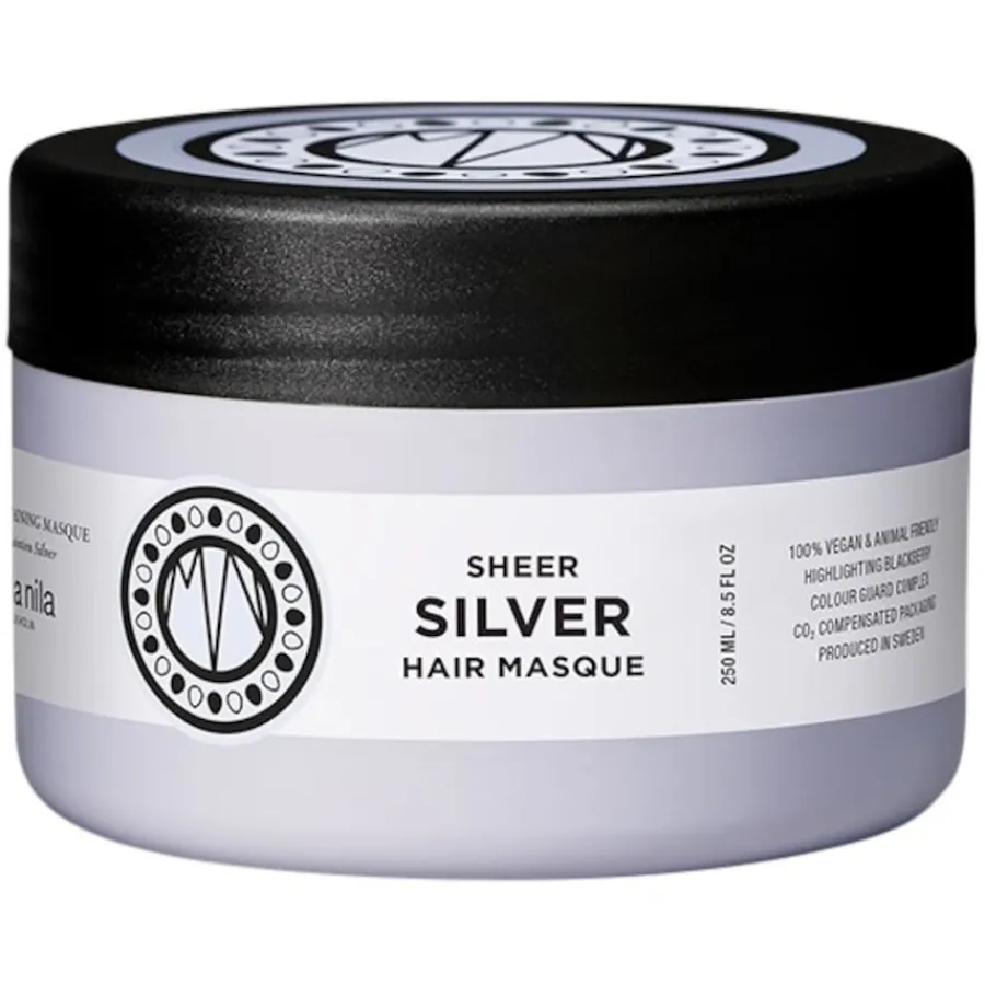 Die Sheer Silver Masque von Maria Nila ist eine reichhaltige Haarpflege für coloriertes Haar mit Heidelbeerextrakten, die den Gelbstich aus blondem, weißem und grauem Haar entfernen. Pflegende Inhaltsstoffe verliehen dem Haar zudem einen gesunden Glanz, während der Farbschutzkomplex vor UV-Strahlen schützt und die Haarbrillanz verlängert.Die Haarkur wird nach dem Schamponieren mit dem Sheer Silver Shampoo auf das Haar aufgetragen und nach drei Minuten wieder ausgewaschen. Sollte Ihr Haar intensivere Pflege benötigen, können Sie die Haarmaske vor dem Auswaschen auch 5 bis 10 Minuten einwirken lassen. Im Anschluss an die Maske ist eine weitere Pflege mit dem Conditioner der Serie empfehlenswert. Für optimale Ergebnisse sollten Shampoo, Spülung und Maske regelmäßig in Kombination angewendet werden.