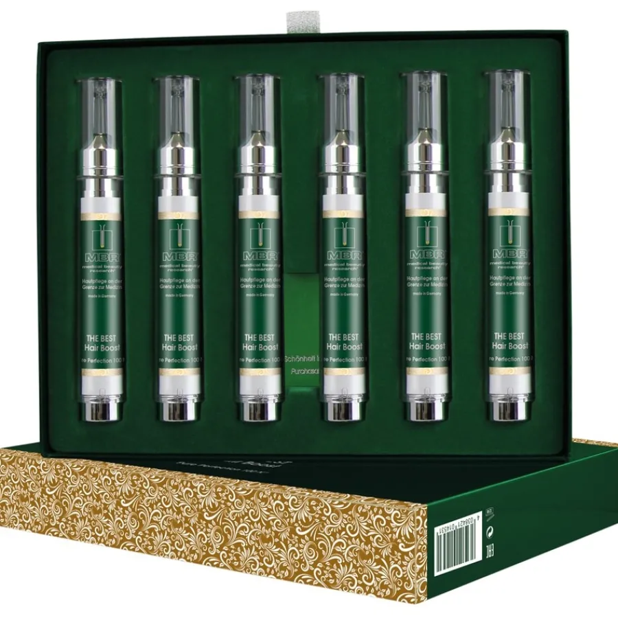Neben dem innovativen Peptid-Komplex basiert die hohe Wirksamkeit von The Best Hair Boost auch auf einem Aminosäure-Komplex, Koffein sowie Hyaluronsäure. Die raffinierte Mischung an Wirkstoffen wird von Provitamin B5, Brennnesselextrakt, Rotkleeextrakt, Vitamin E und Biotin abgerundet. Daher regeneriert sich auch die Kopfhaut mit dem exklusiv von MBR Medical Beauty Research entwickelten Serum für die Haare. Das Haarpflegemittel Pure Perfection 100 N, das es als Packung mit sechs einzelnen Portionen gibt, wird am besten am Abend auf die Kopfhaut und das Haar aufgetragen und mit den Fingerspitzen sanft einmassiert, bis es leicht aufschäumt.
