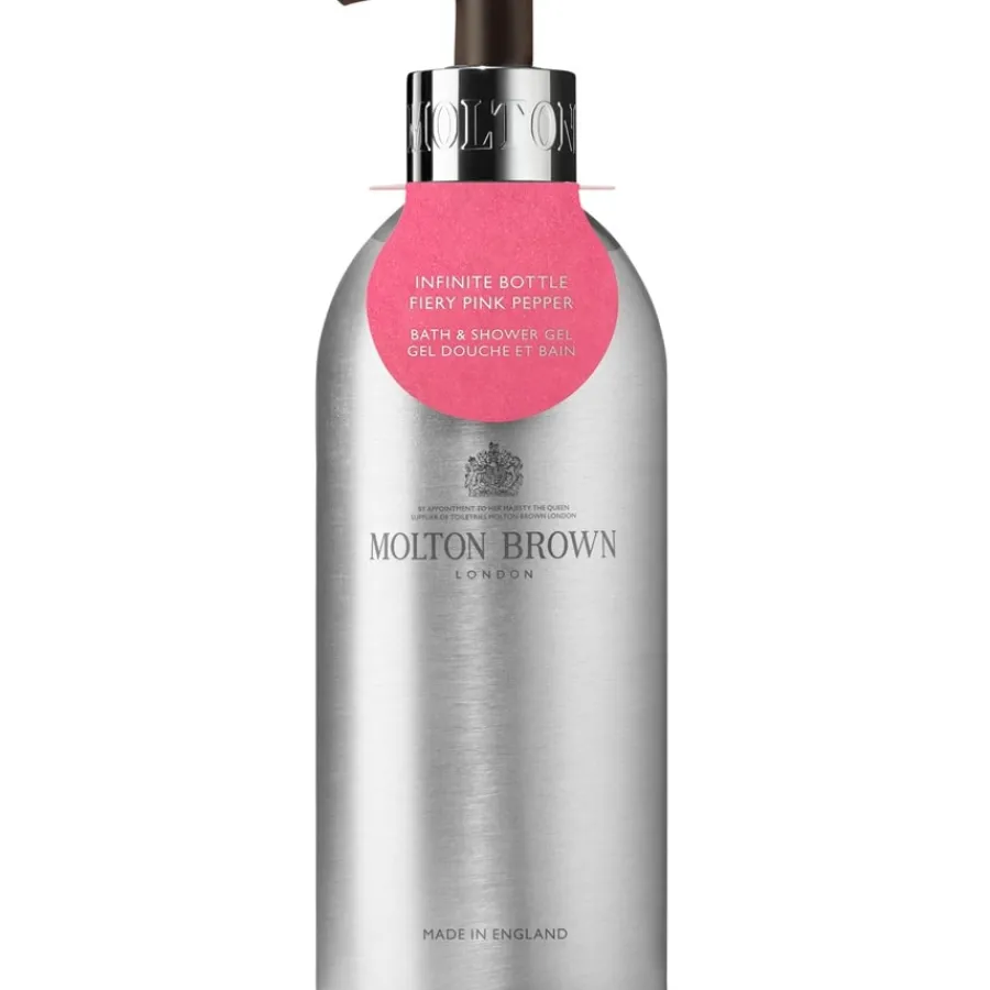 Wenn Sie sich für das Infinite Bottle Fiery Pink Pepper Bath & Shower Gel entscheiden, erhalten Sie nicht nur ein wohlriechendes Gel für Ihre Hautpflege, sondern auch eine hochwertige Flasche, die aus recyceltem Aluminium besteht und 400 ml Volumen aufweist. Sie ist mit dem Logo des Herstellers Molton Brown versehen und wertet Ihr Badezimmer mit ihrem einzigartigen Charme auf.Aluminium rostet übrigens nicht, selbst dann nicht, wenn es im Bad ständiger Feuchtigkeit ausgesetzt ist. Dafür sorgt das Metall selbst, eine besondere Pflege ist nicht erforderlich. Wenn Sie das Bath & Shower Gel aufgebraucht haben, können Sie die Alu-Flasche mit Nachfüllbeuteln übrigens wieder auffüllen. Das ist nachhaltig und macht Spaß.