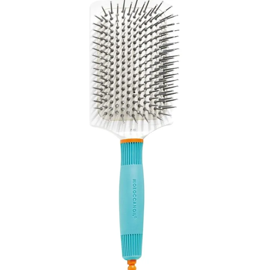 Die Borsten sind dank der Ionen-Technologie wasserabweisend. So kann Feuchtigkeit aus dem Haar schneller Verdunsten, was die Zeit für das Föhnen und Trocknen reduziert. Auch erhält das Haar durch die Paddle Brush XL einen gesünderen, natürlichen Glanz und wirkt sichtbar voller und voluminöser. Die Trockenzeit verringert sich bei der Moroccanoil Bürste noch einmal zusätzlich, da die Keramikteile die Hitze besser bündeln und verteilen, wodurch sich ein allgemein breiteres Frequenzspektrum ergibt.