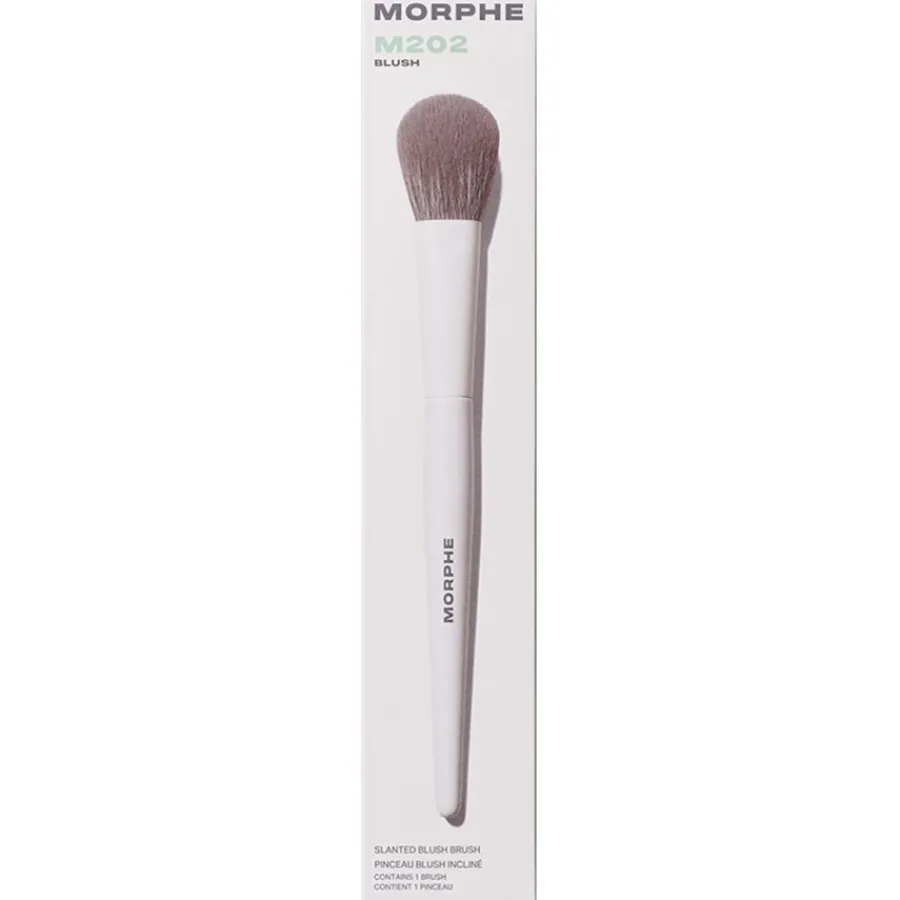 Die M202 Slanted Blush Brush von Morphe gehört zu einem Set hochwertiger Gesichtspinsel, die einen präzisen Auftrag von Rouge und weiteren Make-up ermöglicht. In dieser Variante hilft der Gesichtspinsel mit seiner abgerundeten Form bei einem sauberen und gleichmäßigen Auftrag von Rouge entlang der Wangenknochen.