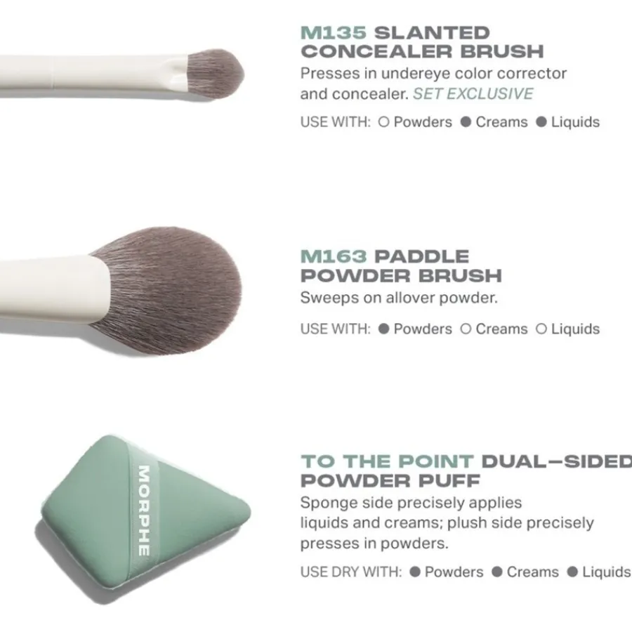 Morphe Gesichtspinsel-Sets wie das Conceal & Set Tool Trio unterstützen Sie bei dem Bestreben, die Qualität Ihres Make-ups auf das nächste Level zu bringen. In dem hier erhältlichen Set aus Make-up-Werkzeugen sind ein Concealer-Pinsel, ein Puder-Pinsel und ein Puderschwämmchen, das beidseitig verwendbar ist, enthalten. Nutzen Sie die Paddle Powder Brush M163, um losen Gesichtspuder auf der Stirn, dem Kinn und den Wangen sowie auf dem Nasenrücken aufzubringen. Für cremigen und flüssigen Concealer können Sie die Slanted Concealer Brush M135 verwenden. Sie verblendet die Flüssigkeiten perfekt und verleiht Ihrem Gesicht einen harmonischen Rahmen. Der To the Point Dual-Sided Powder Puff eignet sich für jede Puder-Textur und gelangt dank seiner beidseitig spitz zulaufenden Form auch zu den Hautpartien, die mit vergleichbaren Schwämmchen nur schwer erreichbar sind. Dank des speziellen, seidigen Haltebands lässt sich das Schwämmchen präzise über die Gesichtshaut führen.