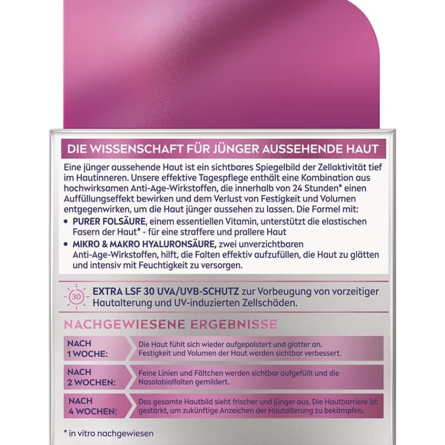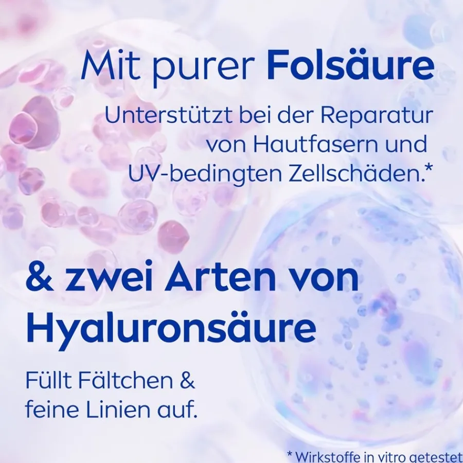 Es muss nicht immer ein kosmetisches oder chirurgisches Lifting sein: Eine durchdachte Kombination von Wirkstoffen kann ebenfalls straffende Effekte haben, wie diese Hautpflege eindrucksvoll unter Beweis stellt. Die Folsäure hat gegenüber den Hautfasern und -zellen einen stärkenden Effekt, währenddessen füllt und hydratisiert die Hyaluronsäure. Die Hautpflege können Sie täglich verwenden, außerdem eignet sich die NIVEA Cellular Filler Anti-Age Tagespflege für alle Hauttypen gleichermaßen. Um langfristig frühzeitige Hautalterung zu verhindern, sollte die Haut täglich mit einer Kombination aus Reinigungs- und Feuchtigkeitsprodukten gepflegt werden, auch sie ein- bis dreimal in der Woche zu peelen, ist angeraten.