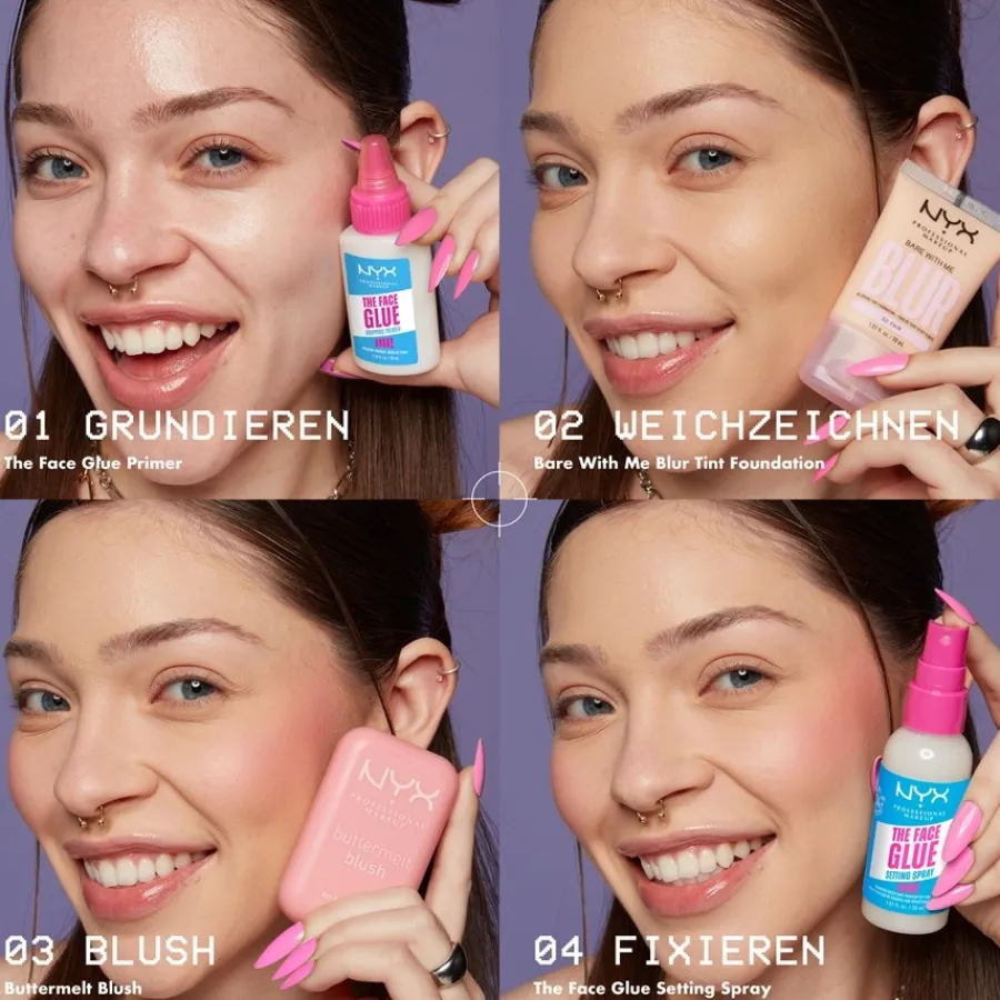 Das The Face Glue Extreme Hold Makeup Setting Spray von der US-amerikanischen Kosmetikmarke NYX Professional Makeup ist die ideale Lösung für ein langanhaltendes Make-up ohne Kompromisse. Die innovative Formel ist mit antioxidativem Ahornsirup-Extrakt angereichert. Sie legt sich wie ein ultradünner Schutzfilm auf die Haut und fixiert das Make-up bis zu 24 Stunden. Zusätzlich werden die Farbpigmente intensiviert und es entsteht ein strahlendes und frisches Erscheinungsbild. Die vegane Zusammensetzung verzichtet auf Inhaltsstoffe tierischen Ursprungs und sorgt für ein angenehmes Tragegefühl ohne klebrige Rückstände.