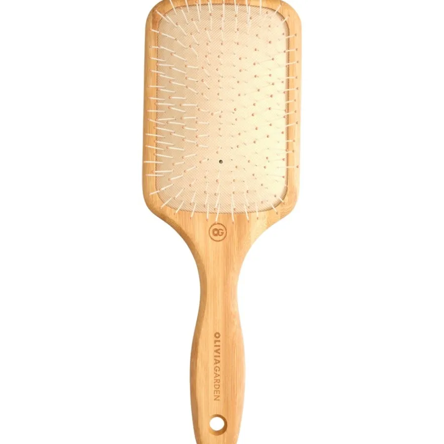 Das hellbraune Bambusholz ist FSC-zertifiziert und zeigt sich in seiner natürlichen, warmen Optik. Bambus ist ein zeitloses Naturprodukt, das sich nicht nur sehr hochwertig anfühlt, sondern auch nachwachsend ist. Die im weichen Bürstenkissen liegenden Borsten sind in elf Reihen angeordnet. Sie bestehen aus Nylon und sind genoppt. Das ist gut für die Kopfhaut und sorgt beim Bürsten ganz nebenbei für eine zarte Kopfmassage. Das antistatische Nylon der Entwirrungsbürste aus Bambus mit genoppten Nylonborsten von Olivia Garden wirkt darüber hinaus einem Fliegen der Haare entgegen.