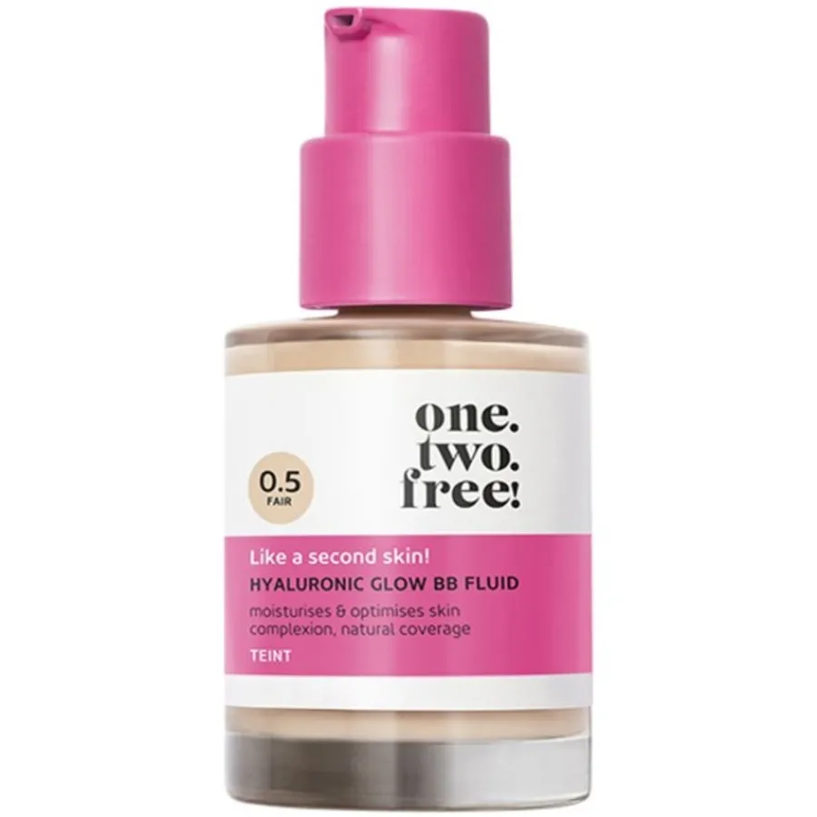 bevorzugen. Durch die Farbpigmente gleicht das Fluid kleine Makel und farbliche Abweichungen aus, sodass die Haut gesund und ebenmäßig aussieht. Um den Teint nicht nur zu verschönern, sondern gleichzeitig zu pflegen, hat One.two.free! das Hyaluronic Glow BB Fluid mit mehreren pflanzlichen Extrakten angereichert, darunter Rainkohl, Kleines Fettblatt und Moringa Oleifera. Eine der Hauptzutaten ist Zitronenverbene, die reich an Flavonoiden ist und antibakteriell wirkt. Um den Feuchtigkeitsgehalt der Haut zu bewahren, enthält das leichte Make-up Squalan. Diese körpereigene Substanz bildet eine Barriere, die schädliche und flüssigkeitsraubende Umwelteinflüsse abblockt. Zugleich wirkt Squalan antioxidativ, wodurch es einer vorzeitigen Alterung der Hautzellen vorbeugt.Dieser schützende Effekt gegen freie Radikale wird durch die Sheabutter im Hyaluronic Glow BB Fluid verstärkt. Das pflanzliche Fett ist reich an wertvollen Ölsäuren, Vitaminen und Mineralien und nährt die Haut. Damit sie nicht nur geschmeidig, sondern auch elastisch bleibt, liefert das Fluid ihr Hyaluron. Der hauteigene Wirkstoff speichert Feuchtigkeit in den tieferen Schichten und polstert das Gesicht von innen heraus auf, wodurch er feine Linien abschwächt.