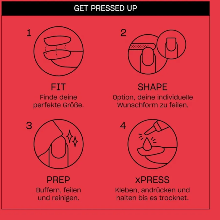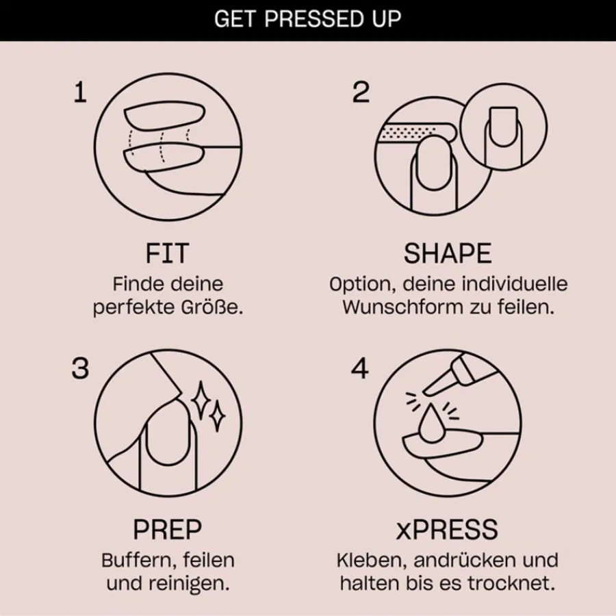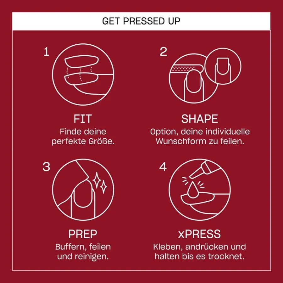 Vorbereitung: Schneiden oder feilen Sie die Länge Ihres Naturnagels ab, um sicherzustellen, dass die Kunstnägel Ihre Naturnägel vollständig bedecken, und polieren Sie die Oberfläche leicht. Entfernen Sie Staub und Rückstände von den Nägeln mit dem Prep to xPRESS Wipe und schieben Sie dann die Nagelhaut vorsichtig zurück.