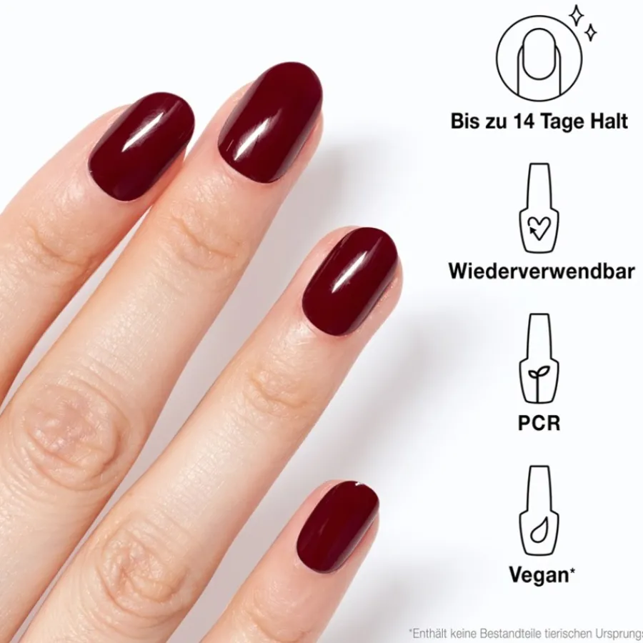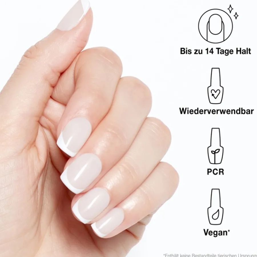 Die Marke OPI steht für hohe Qualität und moderne Designs. Wenn Sie sich für Classic-Kunstnägel entscheiden, wählen Sie einen natürlichen Look durch eine authentische Nagelform, die zu Ihren Naturnägeln passt. Um die xPRESS/ON-Nägel auf den Naturnagel aufzubringen, nutzen Sie den Buffer und rauen die Nageloberfläche auf. Nun wird die Nagelhaut zurückgeschoben und eine dünne Schicht des enthaltenen Klebers auf den Naturnagel aufgetragen. Der Kunstnagel wird vor der Nagelhaut angesetzt und für 30 Sekunden leicht angedrückt. So einfach wie die Anbringung ist auch die Entfernung der Kunstnägel. Hierfür weichst du deine Finger 10 Minuten in lauwarmes Wasser ein, trägst Aceton auf und ziehst den Kunstnagel ganz vorsichtig ab.