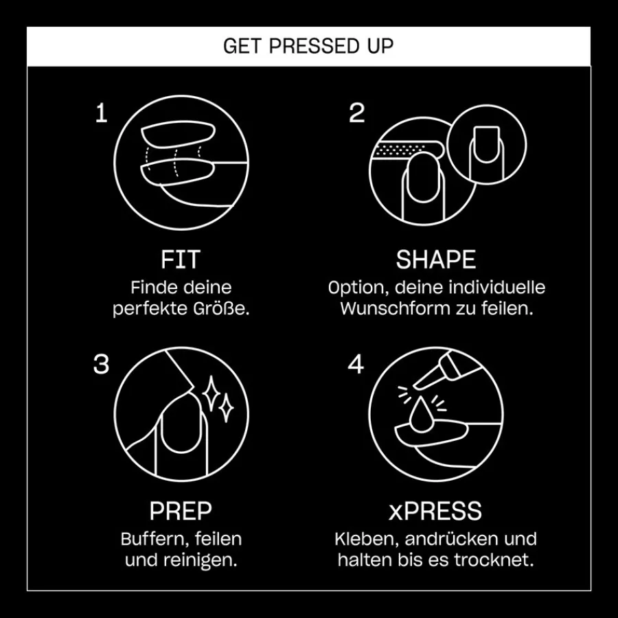 Wählen Sie im ersten Schritt ein Kunstnageldesign in Ihrem bevorzugten Farbton. Großer Beliebtheit erfreuen sich zum Beispiel die Press-on-Nails in der Gold-Variante. Im Set finden Sie dann LONG Kunstnägel in unterschiedlichen Längen, mit der mitgelieferten Doppel-Nagelfeile bringen Sie sie in die gewünschte Form. Die Nageloberfläche können Sie zusätzlich mit einem Buffer mattieren. Ihrer Fantasie sind hierbei keine Grenzen gesetzt – setzen Sie Ihr individuelles Nageldesign um. Folgen Sie anschließend der präzisen und verständlichen Anleitung. Sie wünschen einen Nagellook mit unterschiedlichen Farben? Dann bestellen Sie zwei oder mehr Nagelsets xPRESS/ON und kombinieren Sie lange Kunstnägel aus den unterschiedlichen Packungen!