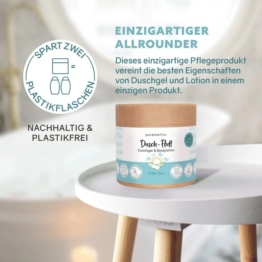 Der Dusch-Fluff After Sun ist eine 3in1 Duschpflege von puremetics, die sich perfekt zur Hautpflege nach sonnigen Tagen eignet. Dank hochwertiger Inhaltsstoffe wie Kokosöl, Allantoin, Aloe vera und Panthenol wirkt das Mittel regenerativ und beruhigt die Haut. Die feuchtigkeitsspendende Wirkung beugt Irritationen vor und hilft, die Haut nach langen Sonnenbädern zu beruhigen. Wer nach einem langen Sonnenbad die Haut entlasten möchte, ist mit dem Dusch-Fluff After Sun von puremetics bestens beraten. Die 3in1 Duschpflege ist Duschgel und Bodylotion in einem und sorgt für ein wohltuendes Erlebnis auf der Haut. Das Mittel bringt die Haut wieder ins Gleichgewicht und ist die optimale Hautpflege nach sonnigen Tagen.