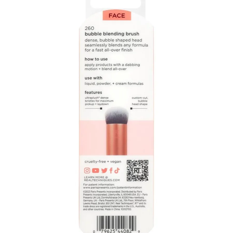 Insgesamt ist der Pinsel sehr leicht gestaltet und erlaubt somit auch längere Schmink-Sessions ohne Ermüdungserscheinungen der Hand. Die Borsten lassen sich einfach reinigen und stehen somit für den nächsten Einsatz sofort wieder parat. Der Real Techniques – Bubble Blending Brush Gesichtspinsel wurde ohne Tierversuche entwickelt und besteht ausschließlich aus synthetischen Materialien. Er eignet sich hervorragend zum Auftragen und Verblenden und kann mit seinen sanften Rundungen den unterschiedlichen Gesichtslinien problemlos folgen. Ein optimaler Gesichtspinsel für alle Anwender, vom Anfänger bis zum echten Make-up-Profi mit großem Sortiment.