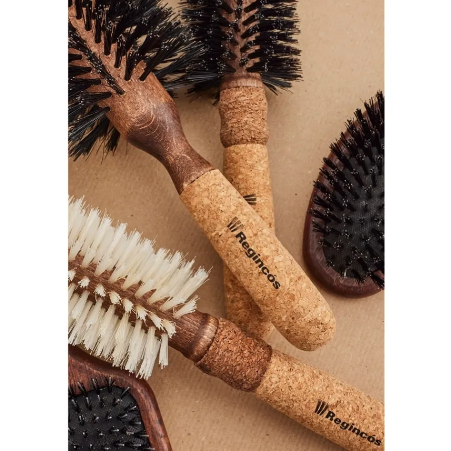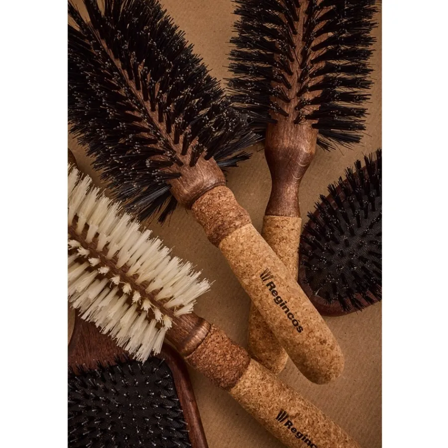 Diese Bürste ist durchdacht gestaltet und teilweise in Handarbeit gefertigt. Für Funktion und Präzision im Gebrauch sorgen der innovative Korkgriff, der handgearbeitete Bürstenkörper aus Holz, die natürlichen schwarzen Wildschweinborsten in Kombination mit hitzebeständigen Nylonborsten aus Kohlefaser. Die Regincós Rundbürste Black Ø 26/80 mm liegt griffig in der Hand und ist durch den Korkgriff besonders leicht. Kork ist als Material eine Entdeckung im innovativen Bürstendesign: Wasserabweisend, antistatisch und optisch im natürlichen Look ist die Bürstenlösung einzigartig. Der verlängerte Griff mit zweifarbigem Kork macht das Styling auch längerer Haare einfach. Die Haare werden gepflegt und nach Wunsch geformt. Mit den dicht gesetzten Borsten entsteht ein feiner, pflegender Massageeffekt. Die Regincós Rundbürste Black Ø 26/80 mm lässt bei der Nachhaltigkeit keine Wünsche offen: Korkgriff, Holzkörper, natürliche Wildschweinborsten und recycelfähige Nylonborsten sind Garanten für eine lange, nachhaltige Freude mit dem Produkt. Auch ein wunderbares Geschenk in Funktion und Ästhetik.