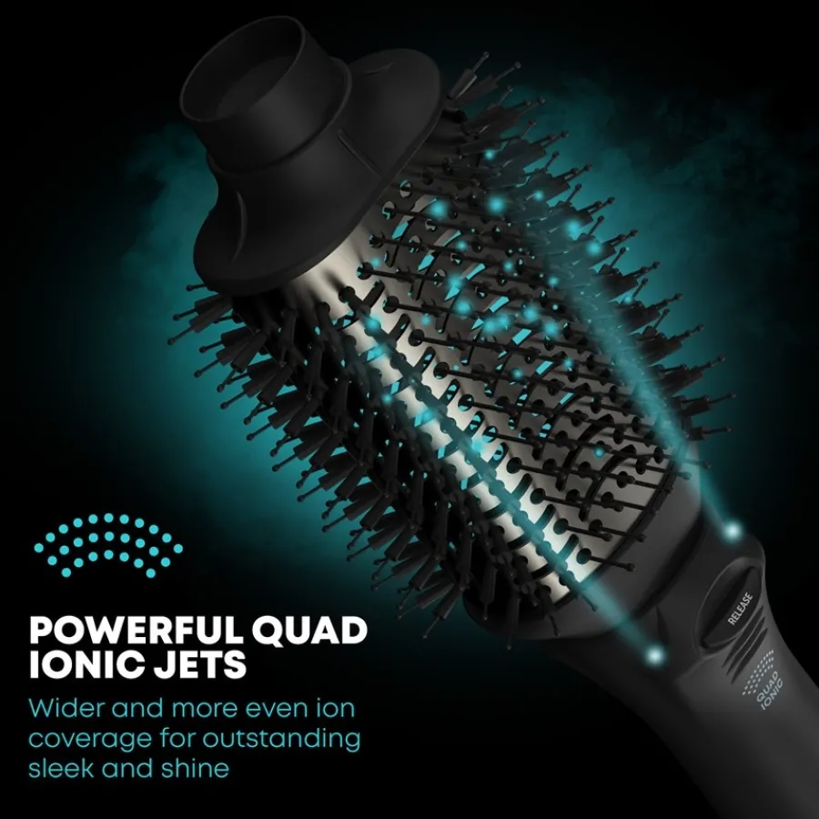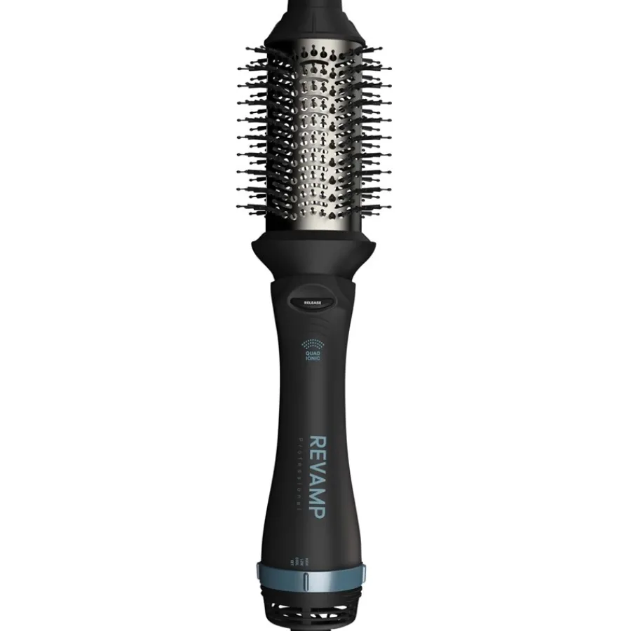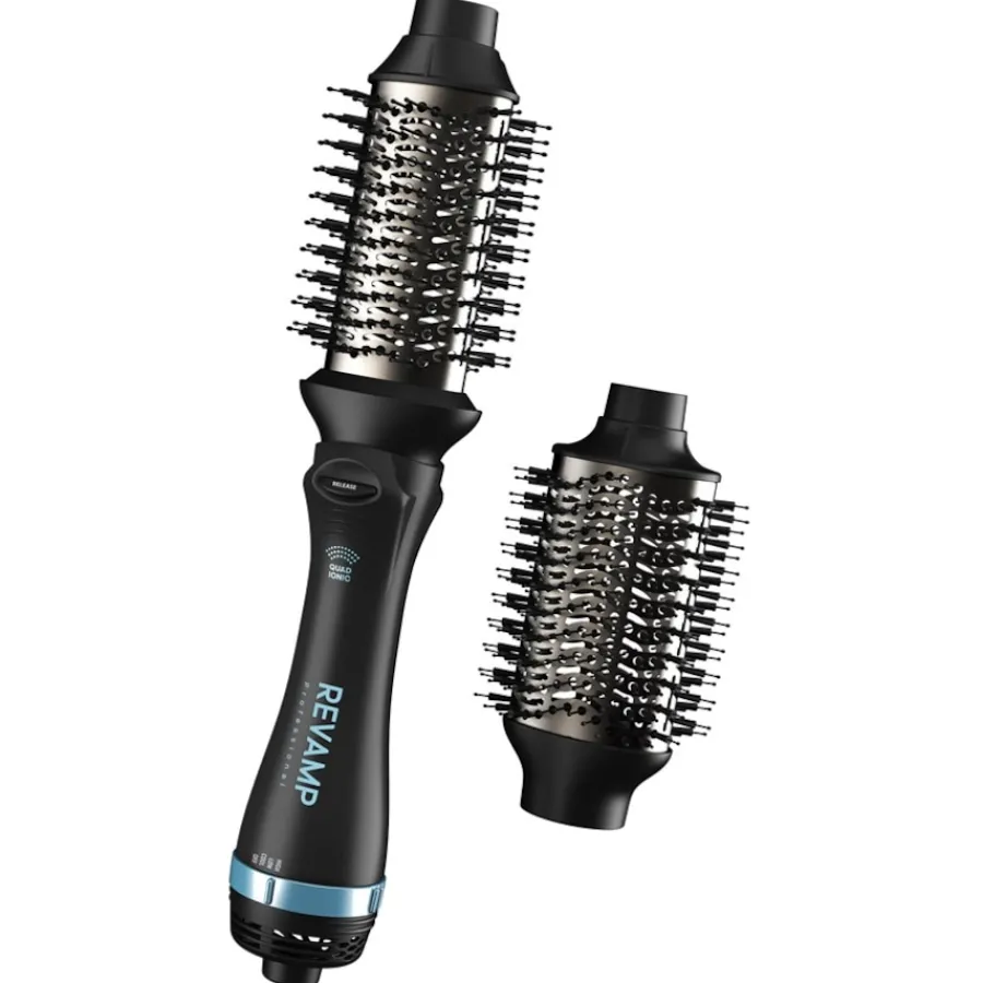 Die Stylers Volume & Style Hot Brush kommt mit zwei auswechselbaren Bürstenköpfen in verschiedenen Durchmessern, um ein ideal angepasstes Ergebnis zu ermöglichen. Störendes Kräuseln wird durch Technologie vermieden, denn dieses Produkt von Revamp Professional besitzt positive und negative Ionendüsen, die für ein ultraglattes Styling sorgen. Für Pflege ist gesorgt, denn die Stylers Brush ist mit wertvollen Ölen und Keratin angereichert. Zudem kann zwischen drei verschiedenen Wärme- und Geschwindigkeitsstufen gewählt werden, um einen schonenden und doch haltbaren Effekt zu erzielen. Die flexiblen und geschmeidigen Borsten machen dieses Produkt zum Erlebnis. Dank der kompakten Maße kann der Haarstyling-Helfer auch ganz bequem unterwegs verwendet werden.