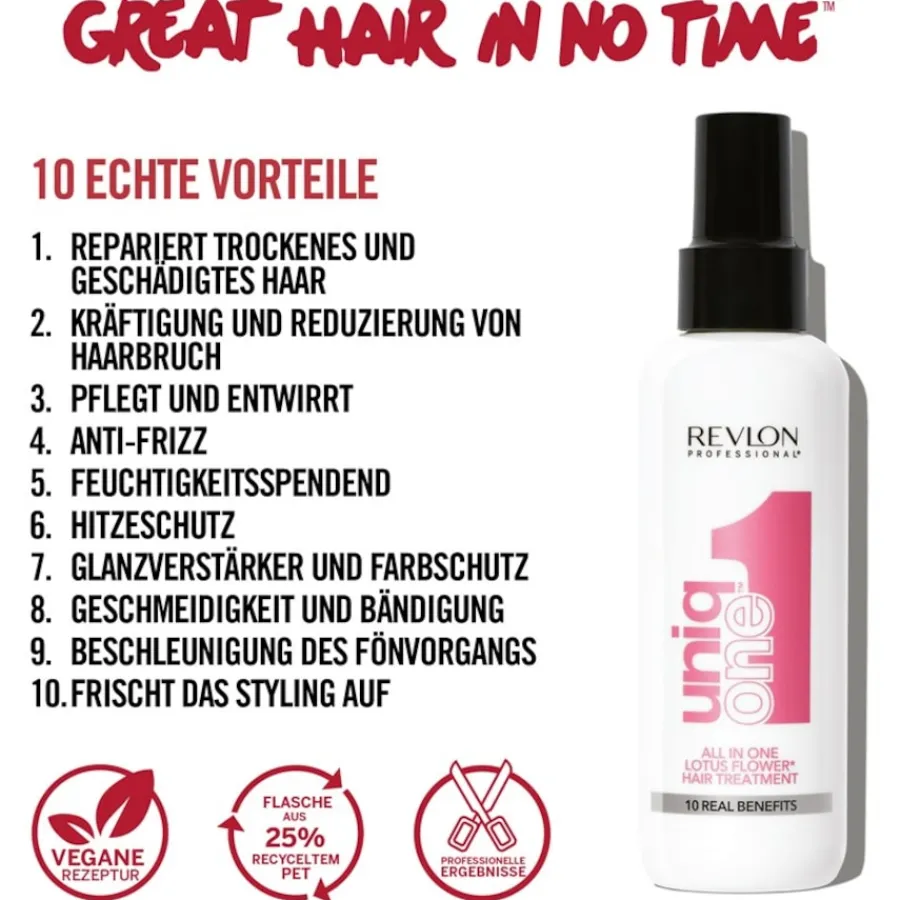 Die pflegende Sprühkur bietet zehn echte Vorteile in einem einzigen Produkt. Frauen mit trockenem und strapaziertem Haar verleiht sie mehr Volumen, einen unwiderstehlichen Glanz und hilft, das Haar wieder aufzubauen. Das Spray repariert und spendet einen wertvollen Hitze- sowie Farbschutz durch UVA- und UVB-Filter, ohne zu beschweren. Gleichzeitig schenkt es geschmeidige Seidigkeit für leichteres Bürsten und Glätten. Das erleichtert das tägliche Styling und sorgt für lang anhaltende Frisuren. Die innovative Formel mit Anti-Frizz Effekt bietet Ihnen die vielfache Pflege, die Sie sich wünschen. Gleichzeitig macht der frische, blumige Lotusduft jede Anwendung zu einem einzigartig sinnlichen Erlebnis.