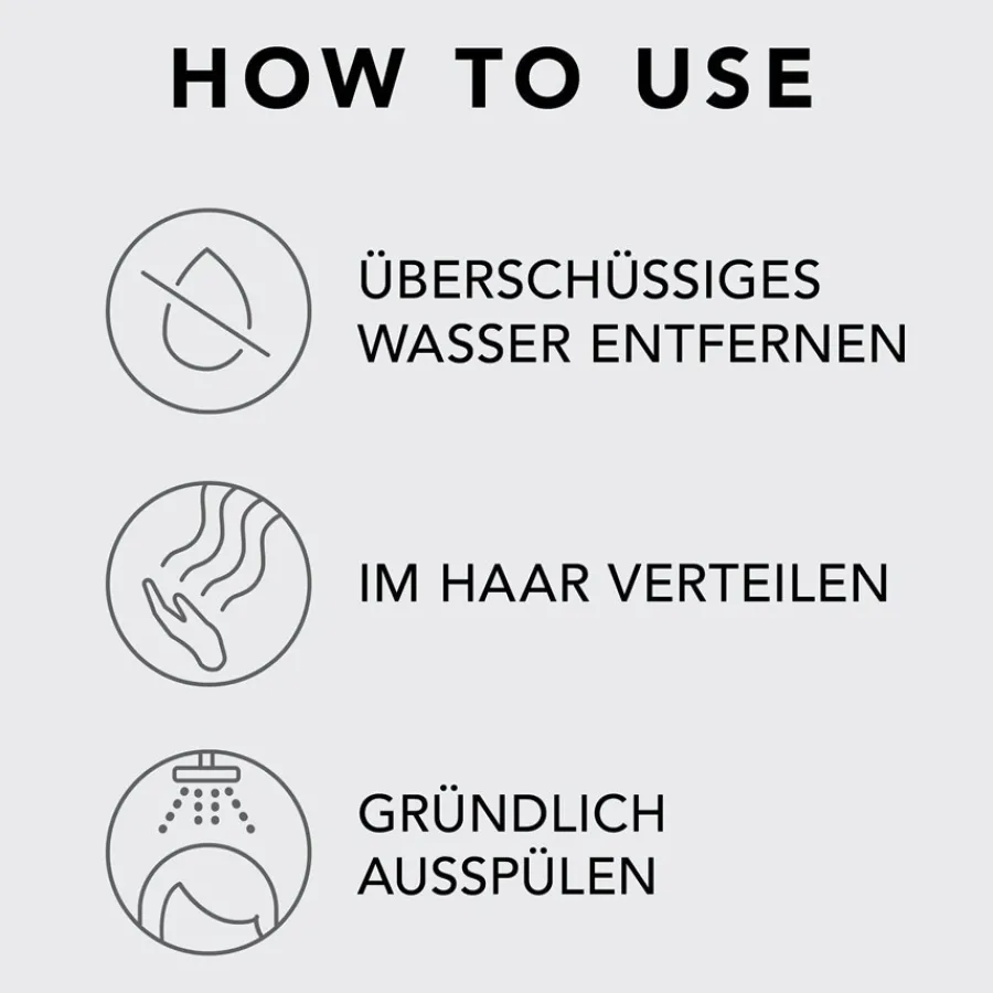 Der Conditioner wird nach der Haarwäsche, idealerweise mit dem Shampoo der Serie, auf die sauberen, handtuchtrockenen Haare aufgetragen und gleichmäßig in den Längen und Spitzen verteilt. Nach einer kurzen Einwirkzeit spülen Sie das Produkt gründlich mit klarem, lauwarmem Wasser aus dem Haar. Damit optimale Ergebnisse erzielt werden, ist eine kontinuierliche Anwendung der Pflegespülung notwendig. Noch intensiver sind die Resultate, wenn Sie die Haarpflege mit weiteren Dark Oil Produkten kombinieren.