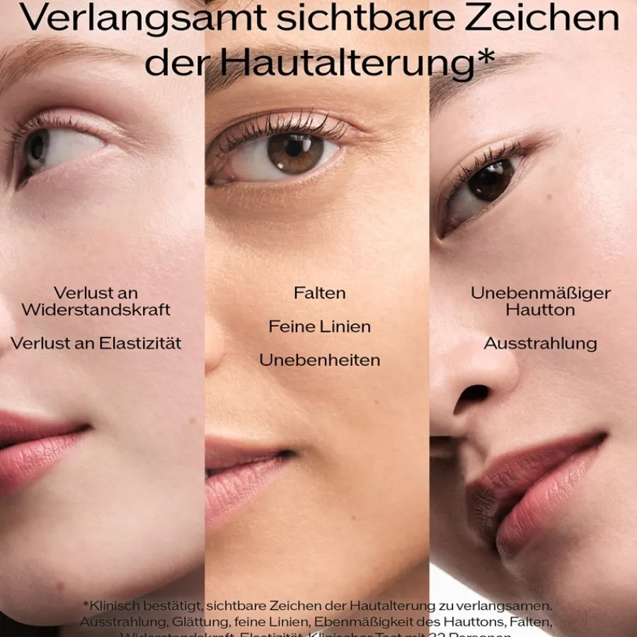 ✔ Sofort: 97 % der Anwender berichten von einer sichtbar strahlenderen Haut.*✔ Nach 2 Wochen: 97 % bestätigen, dass Zeichen der Hautalterung reduziert wurden.*✔ Nach 1 Monat: 98 % nehmen eine verlangsamte Hautalterung wahr.*Das Serum verbessert die Widerstandsfähigkeit der Haut, reduziert Trockenheit, feine Linien und ungleichmäßigen Hautton. Es ist für alle Hauttypen geeignet, auch für empfindliche Haut.