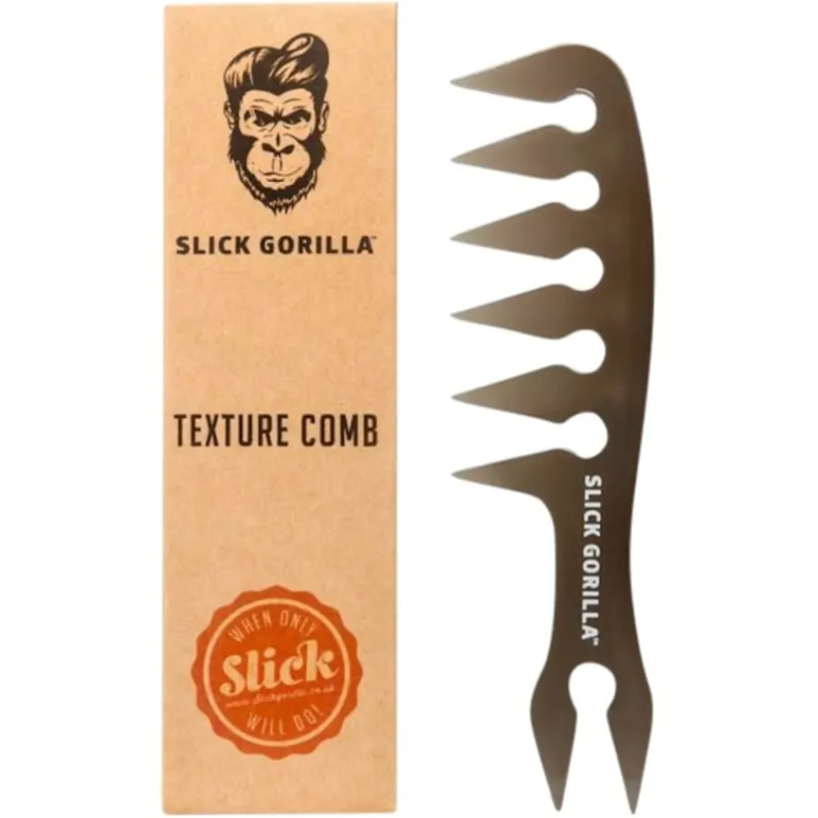 Der Texture Comb liegt mit seiner leicht geschwungenen, ergonomisch angedachten Form sehr gut in der Hand. Das erleichtert es, das Haar mit einem texturierten und glatten Haarstyling zu verwöhnen, das die Blicke auf sich zieht. In Kombination mit dem Lightwork und der Clay Pomade von Slick Gorilla lassen sich stylishe Frisuren mit starker Textur und herrlich definiertem Look kreieren. Die optische Performance ist bei Slick Gorilla eine runde Sache für Haar und Kamm zugleich. Das elegante Design des Kamms wird durch das eingeprägte Logo der Marke angenehm betont. Ein stilvoller Kamm für stilvolle Frisuren. Der Texture Comb gibt dem Haar- gemeinsam mit anderen Haarstyling-Produkten – einzigartiges Volumen, Kontrolle und Textur.