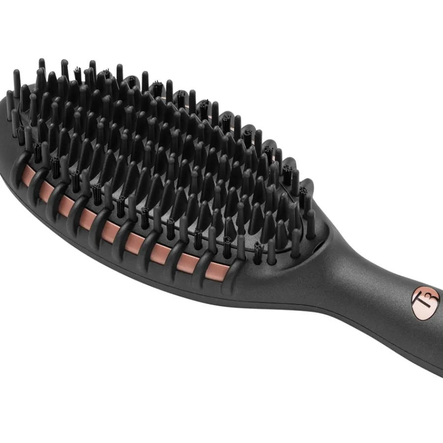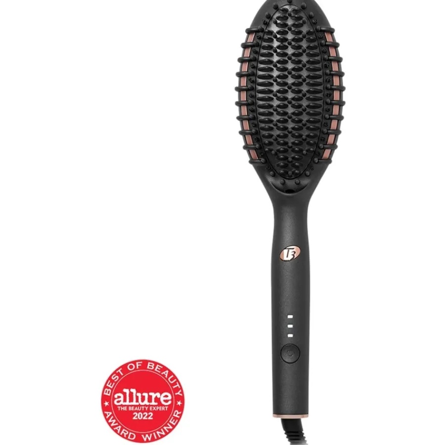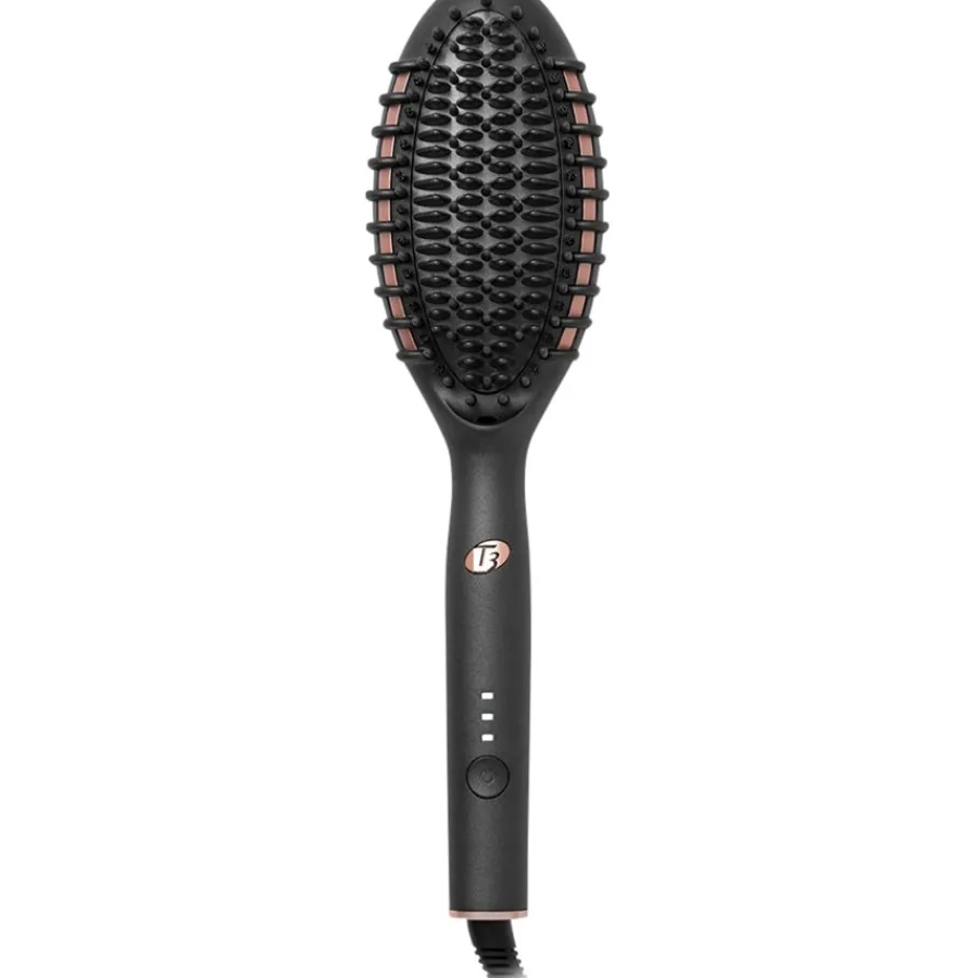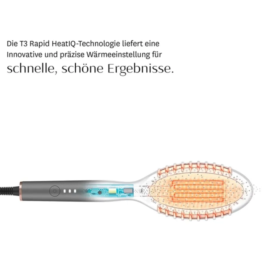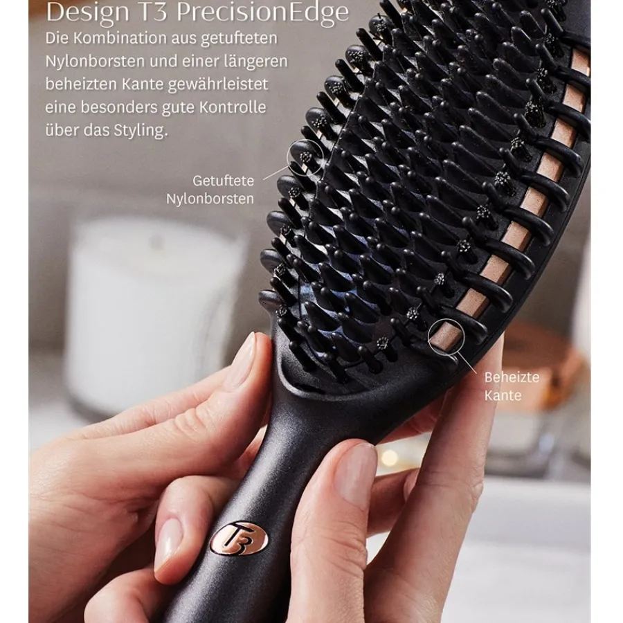 bringt das Haar auf Hochglanz. Er minimiert Frizz und gewährleistet lang anhaltende Resultate. Die elektrischen Haarbürsten von T3 nutzen die Rapid-HeatIQ-Technologie. Ihnen stehen drei Wärmestufen zur Auswahl. Die Temperatur wird von einem Mikrochip überwacht und konstant gehalten. Das Haarstyling ist somit noch einfacher. Optisch unterscheidet sich das Gerät nicht von konventionellen Haarbürsten. Lediglich der Taster und das Kabel fallen auf. Letzteres ist 2,4 Meter lang und lässt sich um 360 Grad drehen. Das schützt vor dem Verbiegen und Verwickeln. Neben der Grundplatte sind die Zähne beheizt. Die Bürste gleitet sanft durch das Haar. Dabei hält sie die optimale Spannung. Durch den schlanken Griff liegt die beheizte Glättungs- & Stylingbürste Edge selbst bei langer Nutzung gut in der Hand. Nach einer Stunde schaltet sie sich aus Sicherheitsgründen automatisch ab. Eine Übersitzungsgefahr besteht zu keinem Zeitpunkt.