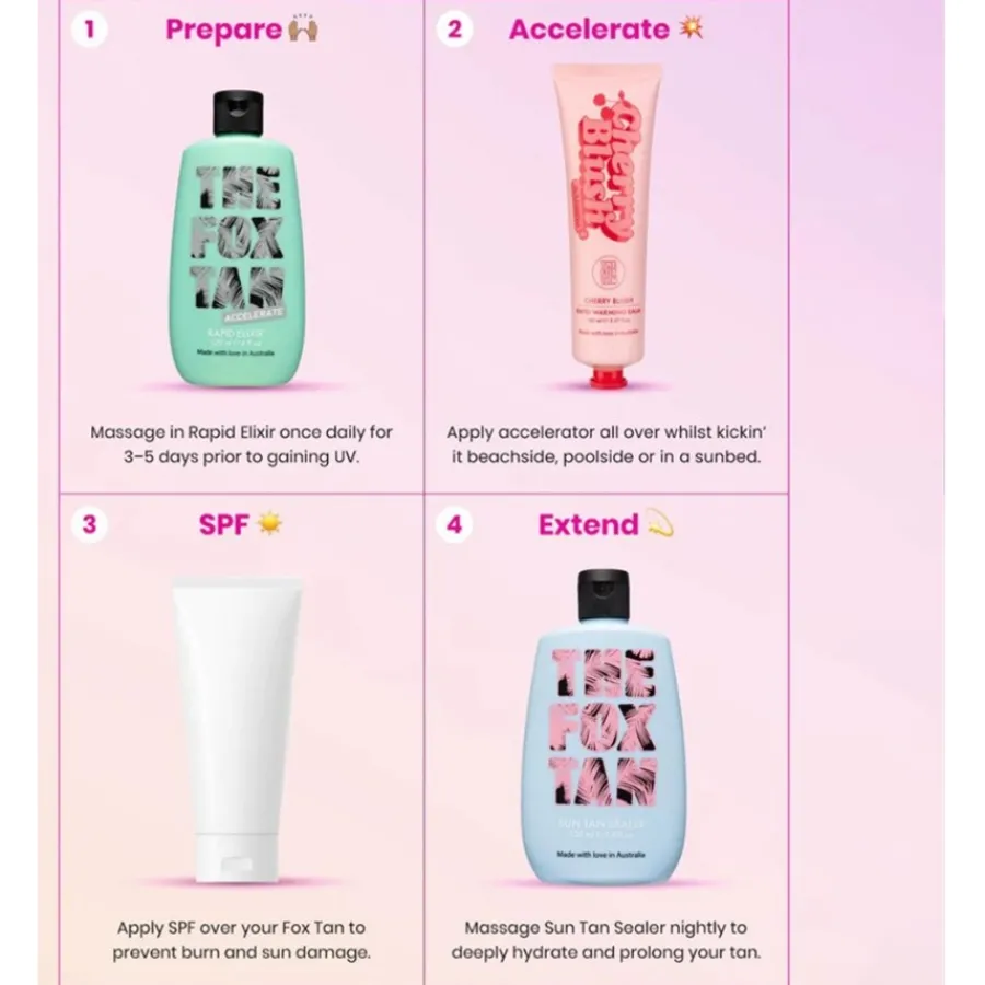 Mit dem süßen, würzigen THE FOX TAN Cherry Blush Rapid Warming Balm aus der Accelerators-Kollektion verleihen Sie Ihrer Haut beim Sonnenbaden im Nu eine natürliche, dunklere Bräune. Diese intensive Wirkung entsteht durch den exklusiven FoxComplex, der die natürliche Melaninproduktion beschleunigt, während Sie in der Sonne entspannen. Zusätzlich ist die Rezeptur mit wärmendem Zimt angereichert, der die Blutzirkulation anregt. Ebenfalls in der Formel enthalten sind pflegende Inhaltsstoffe wie Hyaluronsäure, Jojobaöl, Arganöl und Aloe vera, die Ihre Haut mit einer Extraportion Feuchtigkeit versorgen. Für ein lang anhaltendes Strahlen der Haut sorgen schimmernde Bronzingperlen. Doch das ist nicht alles, was Ihnen der Selbstbräuner zu bieten hat! Die Haut ist in einen sanften Duft nach Kirschen gehüllt.