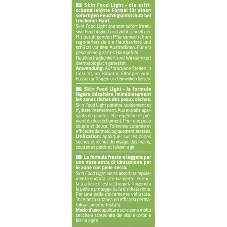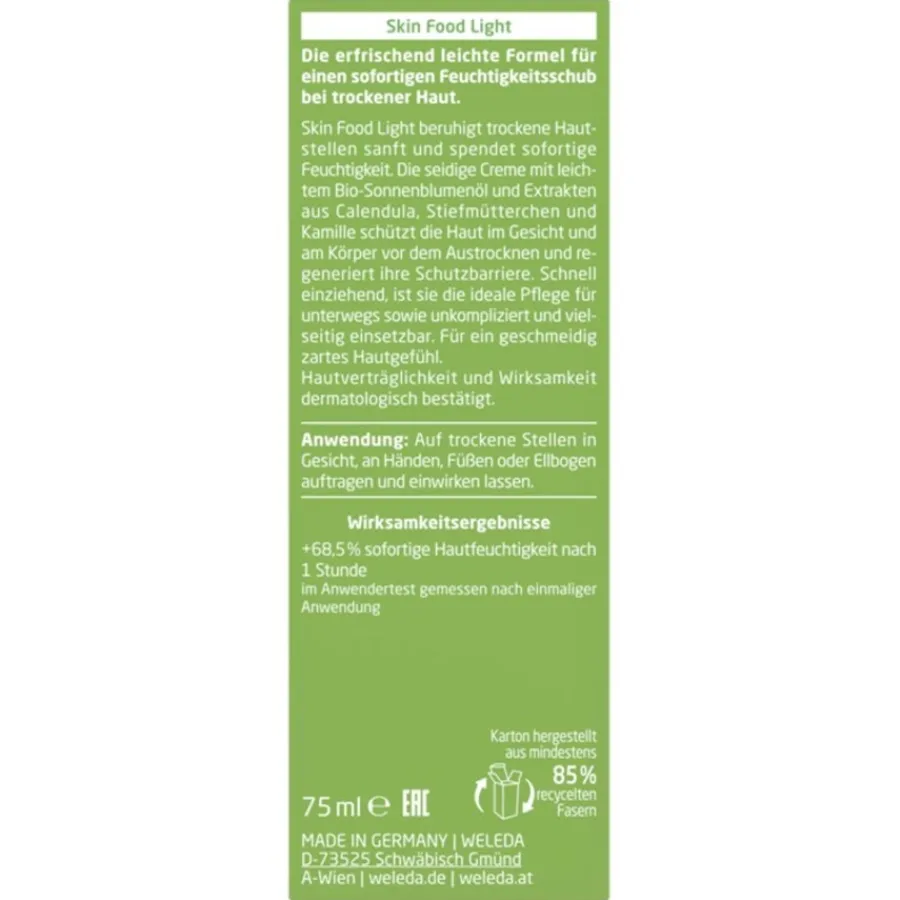 Die Weleda Skin Food Light Tagespflege ist eine Weiterentwicklung der beliebten Skin Food Creme aus dem Hause Weleda, die im Gegensatz zum Original noch leichter ist und somit schneller in die Haut einzieht – wodurch sie sich auch hervorragend als Begleiter im Urlaub oder auf längeren Ausflügen eignet. Sie versorgt trockene Haut sofort mit viel wertvoller Feuchtigkeit und eignet sich sowohl für eine Anwendung im Gesicht als auch auf allen anderen Regionen des Körpers. Die idealerweise nicht fettende Creme beinhaltet viele wertvolle Inhaltsstoffe aus der Natur, zu denen u.a. Bio-Sonnenblumenöl, Bio-Kakaobutter, Bio-Bienenwachs und Bio-Sheabutter gehören, die die Haut direkt nach der Anwendung angenehm weich und geschmeidig machen. Die Haut wird somit effektiv vor dem Austrocknen geschützt und kann sich fortan endlich von ihrer schönsten Seite zeigen. Zur Anwendung einfach auf die gewünschten Hautbereiche auftragen und mit kreisenden Bewegungen einmassieren.
