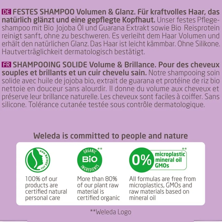 Der Hauptinhaltsstoff im festen Shampoo Volumen & Glanz von Weleda ist Bio-Jojobaöl – ein flüssiges Wachs, das dem natürlichen Lipidfilm auf der Haut sehr ähnlich ist und sich daher gut mit ihm vermischt. Jojobaöl bewahrt Haare und Kopfhaut vor Feuchtigkeitsverlust, ohne zu fetten. Ergänzt wird die positive Wirkung von Jojobaöl durch Bio-Reisprotein und Guarana-Extrakt. Das feste Shampoo bildet bei Wasserkontakt einen zarten Schaum, der sich gut im Haar und auf der Kopfhaut verteilen und leicht wieder auswaschen lässt. Nach der Haarpflege ist das Haar angenehm geschmeidig und lässt sich leichter kämmen. Nicht zuletzt überzeugt Festes Shampoo Volumen & Glanz durch einen fruchtig-frischen Duft nach Bergamotte, Lavendel und Zedernholz.