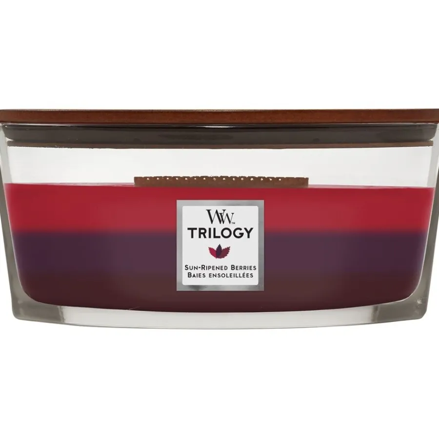 Die Trilogie-Kerze besteht aus mehreren Farbschichten. Jede Farbschicht ist mit einem eigenen Duft angereichert. Beim Abbrennen der WoodWick-Duftkerze Sun-Ripened Berries verschmelzen die einzelnen Duftschichten miteinander und es wird ein einzigartiger, betörender neuer Duft kreiert. Genießen Sie eine Duftkomposition aus Currant, Spiced Blackberry und Black Cherry. Currant als oberste Duftschicht regt Ihre Sinne mit einer belebenden Mischung aus köstlichen, üppigen Johannisbeeren und Akkorden von saftiger Mandarine an. Die reichhaltigen Brombeeren mit Zimt- und Vanillenote der mittleren Duftschicht Spiced Blackberry und die Süße von saftigen dunklen Kirschen der Grundschicht Black Cherry runden dieses olfaktorische Genusserlebnis ab. Lehnen Sie sich zurück und lassen Sie sich von den einladenden Düften von Sun-Ripened Berries und dem sanften Knistern des natürlichen Holzdochtes betören.
