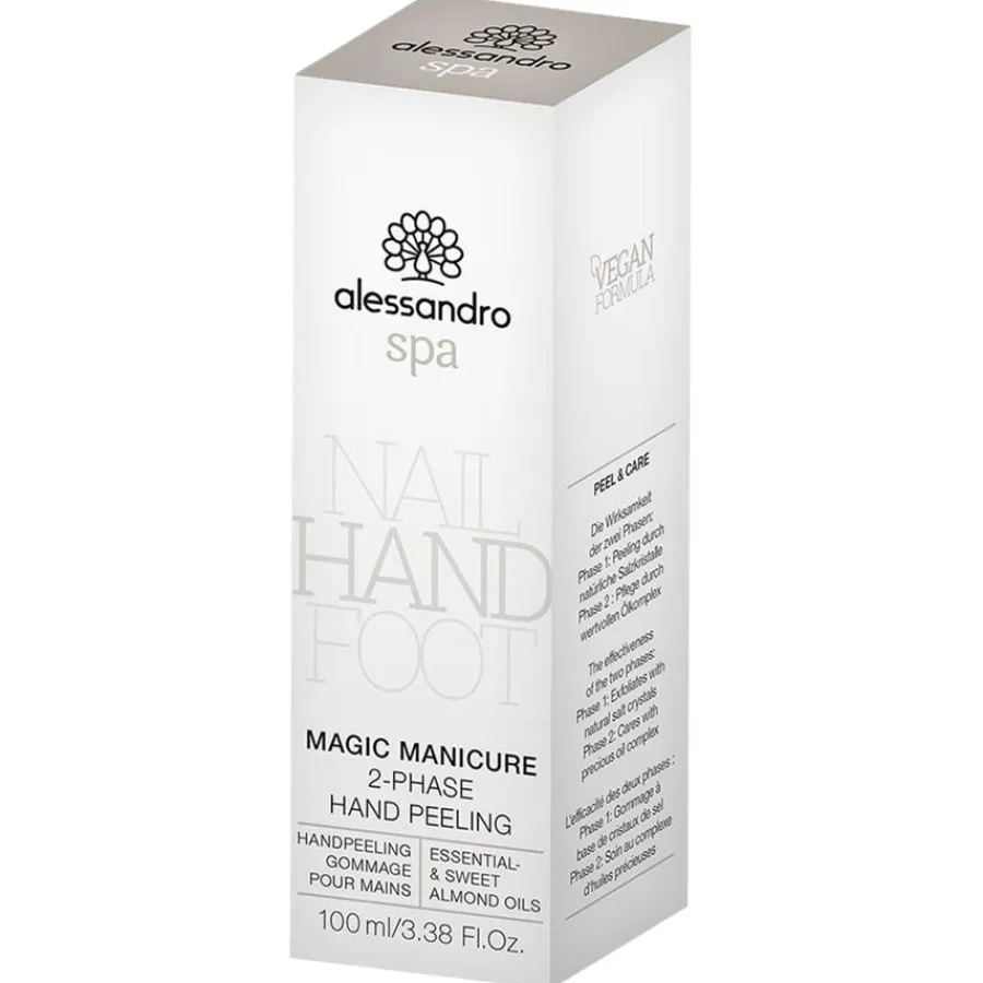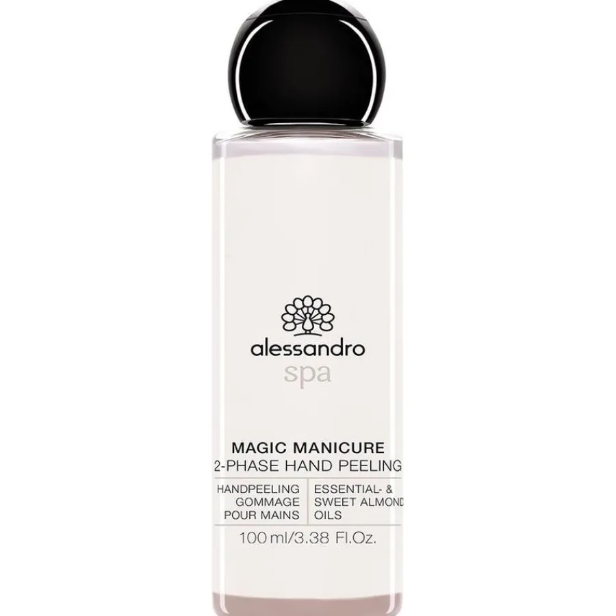 Das für alle Hauttypen konzipierte Spa Magic Manicure 2-Phase Handpeeling aus dem Kosmetikhaus Alessandro sorgt für perfekt gepflegte Hände. Die in nur 60 Sekunden mit einzigartigen Ergebnissen überzeugende Handpflege wirkt in zwei Phasen. Neben dem effektiven Peeling versorgt diese hochwertige Hautpflege die Haut Ihrer Hände von den Fingerspitzen bis zu den Handgelenken mit vielen wertvollen Zutaten. In der Formel der flüssigen Pflege stecken unter anderem Meersalz, Linolsäure sowie die beiden Hautöle Mandelöl und Traubenkernöl. Während das Traubenkernöl die sensible Haut der Hände bei regelmäßiger Anwendung mit einer Vielzahl von Antioxidantien vor den gefürchteten Umwelteinflüssen schützt, minimieren Meersalz und Linolsäure die typischen Hautreizungen des Alltags.