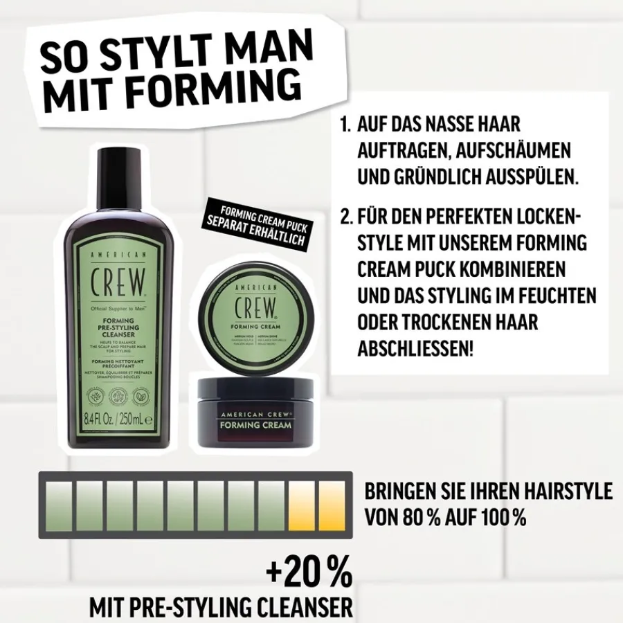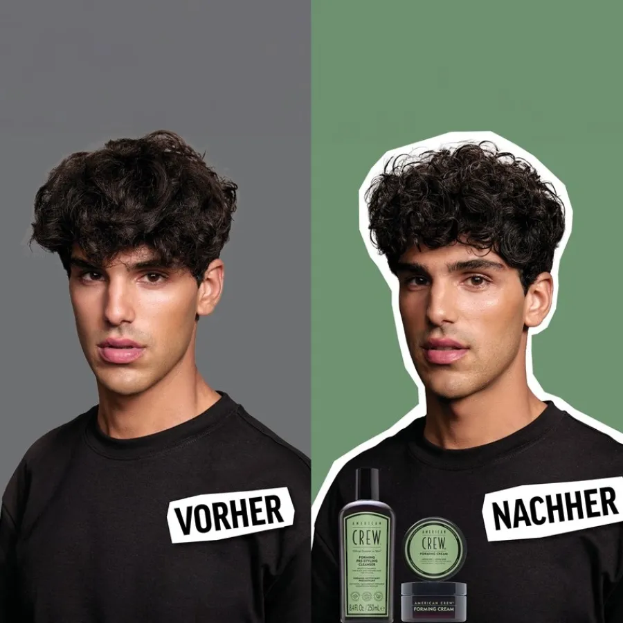 Zur täglichen Haarpflege wird eine kleine Menge des Produkts von American Crew in die Hand gegeben, hier leicht aufgeschäumt und nun gleichmäßig im nassen Haar oder auf der Haut des Körpers verteilt. Einmassieren verstärkt die pflegende Wirkung. Nach Belieben kann Forming Pre-Styling Cleanser auch ausgespült und noch ein weiteres Mal auf die gleiche Weise verteilt werden. So werden auch Locken oder zu Frizz neigendes Haar wieder fein definiert und gestärkt.
