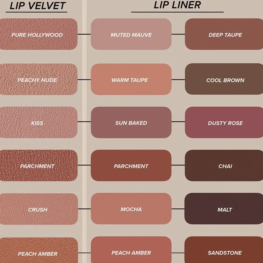 | Colour | Blackberry, Cool Brown, Crush, Hush Rose, Kiss, Pale Mauve, Parchment, Peach Amber |
