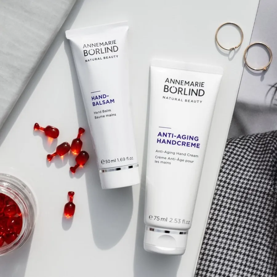 Die Anti-Aging-Handcreme von ANNEMARIE BÖRLIND tut allen beanspruchten Händen gut. Der Bio-Blätter-Extrakt der Zaubernuss wirkt antientzündlich und heilend. Das Allantoin findet man in der Natur im Beinwell sowie in der Schwarzwurzel und in der Rosskastanie. Es wirkt reizlindernd sowie regenerierend und eignet sich ideal für die Körperpflege. Auch der Ringelblumenblüten-Extrakt wirkt entzündungshemmend, ebenso der Kamillenblüten-Extrakt. Das Vitamin E wirkt als Antioxidans und schützt vor freien Radikalen, es beugt UV-bedingten Hautschäden vor. Lecithin wirkt pflegend und stabilisiert die enthaltenen Emulsionen.