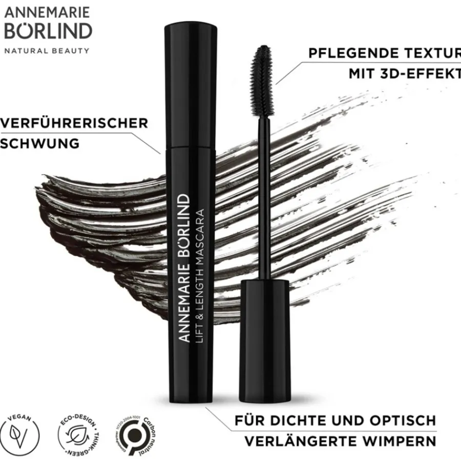 Bei ANNEMARIE BÖRLIND treffen Inhaltsstoffe natürlichen Ursprungs auf innovative Formeln. Natur und Innovation schließen sich bei diesem Naturkosmetik-Hersteller nicht aus. In den Produkten sind Inhaltsstoffe aus kontrolliert biologischem Anbau oder aus Wildsammlung enthalten. Das Wasser stammt aus eigenen Quellen im Schwarzwald. Die Verträglichkeit der Produkte ist ärztlich bestätigt. Selbstverständlich wurde auch die Mascara augenärztlich überprüft.Setzen Sie das Bürstchen am Wimpernkranz an und ziehen sie es bis in die Spitzen. Wiederholen Sie den Vorgang so lange, bis Sie Ihr gewünschtes Ergebnis erreicht haben. Nutzen Sie das Make-up von BÖRLIND und bringen Sie Ihre Augen ganz einfach zum Leuchten. Lift & Length Mascara – für mehr Schwung, Volumen und Länge! Jetzt bestellen und testen.