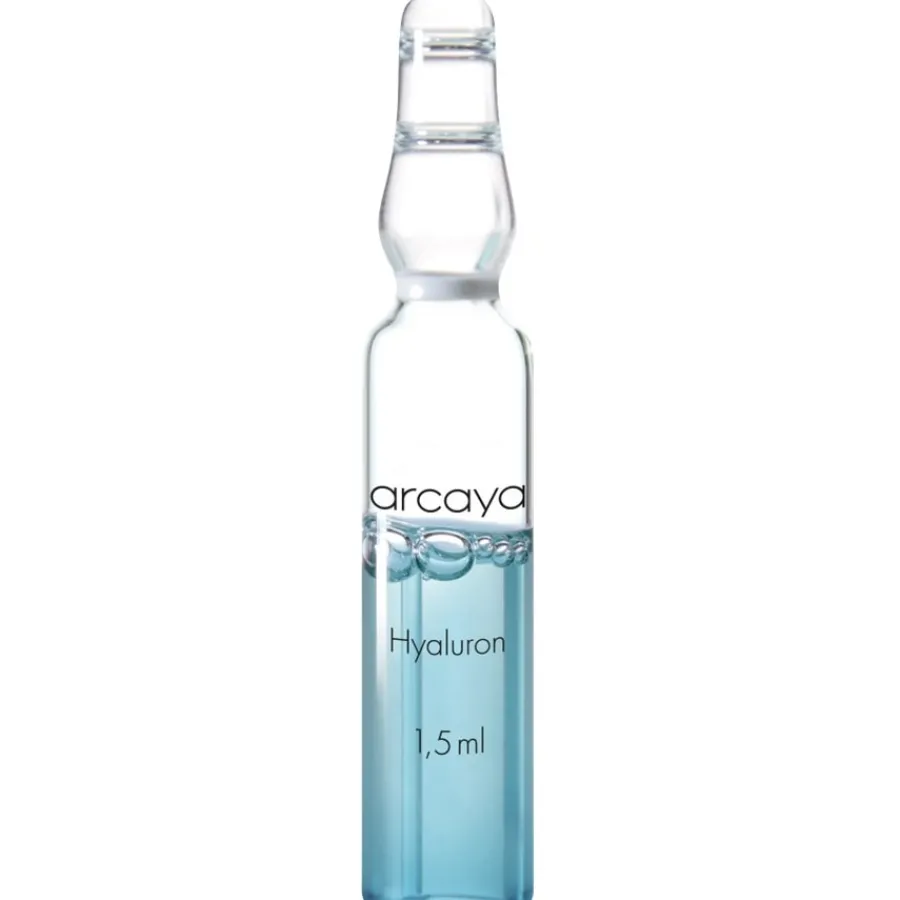 Der Wirkstoff findet jedoch auch in der Haut- und Gesichtspflege Verwendung. Hyaluronsäure ist ein natürlicher Bestandteil des menschlichen Bindegewebes, von Gelenkflüssigkeit und Knorpel. Im Laufe der Jahre geht der Anteil an Hyaluronsäure im Gewebe jedoch zurück. Die Arcaya Hyaluron Ampullen führen der Gesichtshaut den Wirkstoff von außen wieder zu. Die in den Ampullen enthaltene Hyaluronsäure füllt die Zwischenräume der Kollagenfasern auf und mindert mit sofortigem Effekt Mimik- und Trockenheitsfältchen. Zur Anwendung einfach den Inhalt einer Ampulle im Gesicht verteilen und sanft einmassieren.
