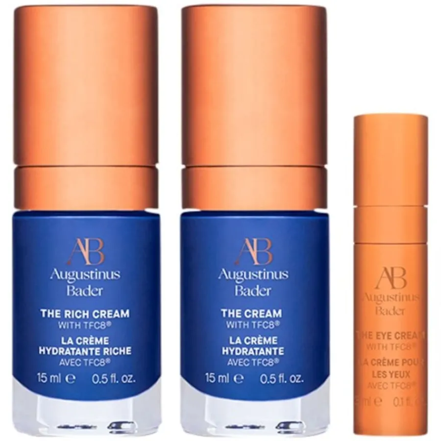 In dem optisch ansprechend verpackten Geschenkset des Kosmetiklabels Augustinus Bader finden Damen drei hochwertige Produkte für die tägliche Hautpflege. Neben einer Flasche The Cream sind auch je eine Flasche The Cream Rich und The Eye Cream im Set enthalten. Diese Pflegeprodukte sind die perfekte Basis für eine Anti-Aging-Routine für Ihr Gesicht. Die Formel von The Cream Rich überzeugt bei der täglichen Anwendung als reichhaltige Feuchtigkeitspflege. Bei regelmäßiger Anwendung minimiert diese Pflegeformel die typischen Anzeichen der lichtbedingten Hautalterung wie zum Beispiel kleine Falten, Linien und Pigmentflecken. Mithilfe des patentierten Inhaltsstoffs TFC8(R) werden die Wirkstoffe gezielt in die Hautzellen transportiert. Sie spüren die jugendliche Elastizität und die Geschmeidigkeit Ihrer Haut.