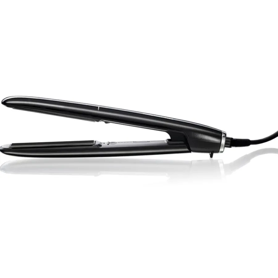 Der Black Stilista Styler aus dem Kosmetikhaus BaByliss Pro überzeugt als einfach zu bedienendes Glätteisen. Innerhalb von nur 40 Sekunden heizt das Gerät bis zu einer Temperatur von 220 Grad Celsius mithilfe des patentierten Heizsystems Advanced Ceramics(TM) auf. Die Platten aus echtem Titan haben eine Größe von 25 x 110 Millimetern. Dank der beliebten Anti-Frizz-Ionentechnologie wird Ihr Haar beim Stylen perfekt glatt, ohne zu fliegen. Sie haben während des Frisierens die Wahl zwischen fünf verschiedenen Temperaturen, die Sie über eine digitale Anzeige kontrollieren können. Wenn Sie gerne immer wieder mit derselben Temperatur stylen, steht Ihnen die intelligente Speicherfunktion für die letzte Einstellung zur Verfügung. Außerdem bleibt das Gehäuse bei jeder Hitze kühl.