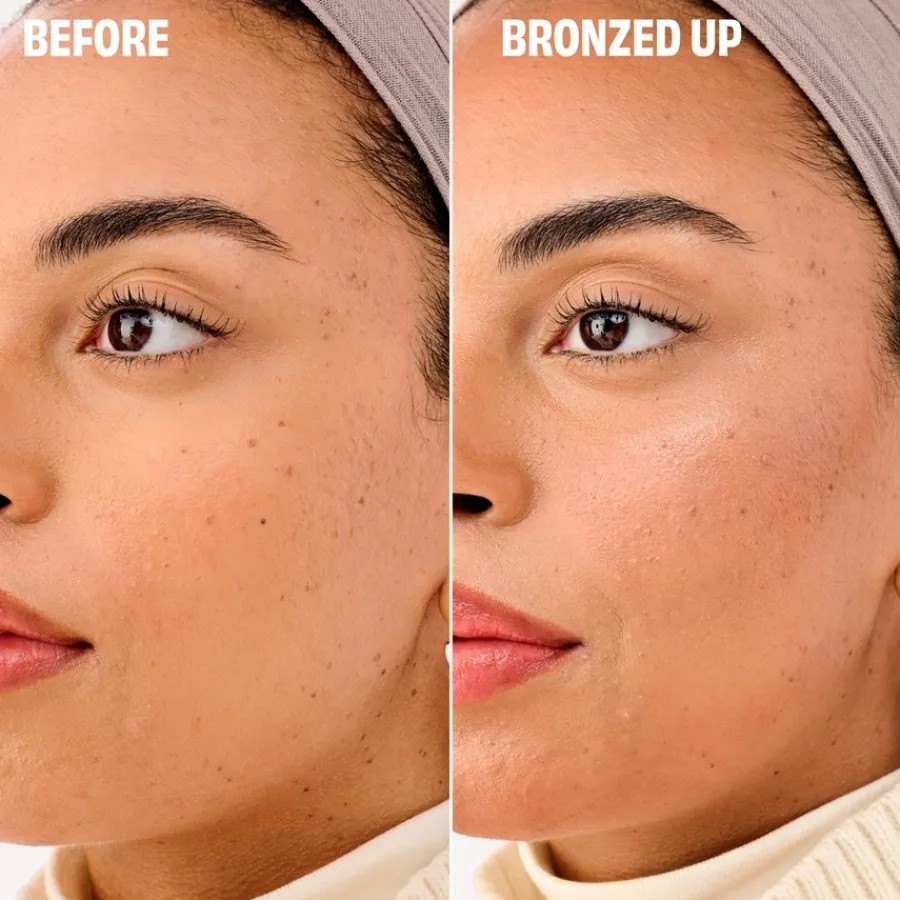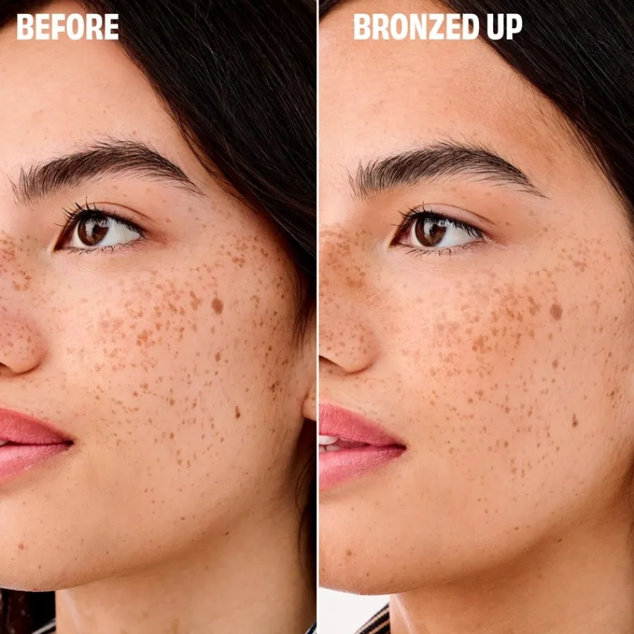 Zum Konturieren unter den Wangenknochen, entlang des Haaransatzes und der Kieferpartie auftragen. Für einen gebräunten Gesamtlook auf Dekolleté und Schultern stäuben!
