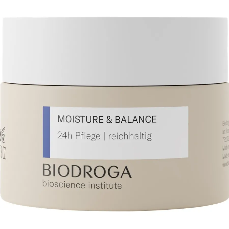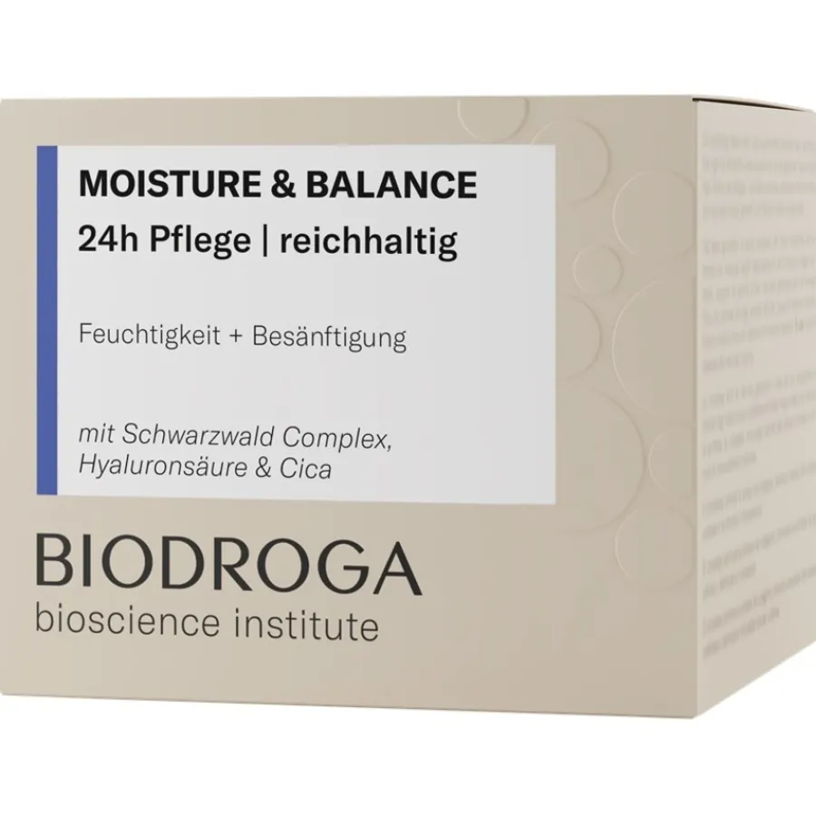 Das Geheimnis der Moisture & Balance 24H Pflege Reichhaltig ist ihre besondere Formulierung mit Hyaluronsäure, antioxidativem Cica und dem speziellen Schwarzwald Complex von Biodroga. Dieser enthält verschiedene Pflanzeninhaltsstoffe aus dem Wald, die die Haut mit allem versorgen, was sie braucht, um wieder strahlen zu können. Holunder spendet ihr Feuchtigkeit und wirkt entzündungshemmend. Überdies fördert er die Regeneration gestresster Haut und beruhigt sie. Auch Farn lindert die Symptome strapazierter Haut, tonisiert sie und fördert ihre Balance. Weiterhin enthält die Hautpflege feuchtigkeitsspendendes Moos, das die natürliche Hautbarriere unterstützt und ihre Widerstandsfähigkeit erhöht, sodass sie sich besser an die Anforderungen klimatischer Stresssituationen anpassen kann.