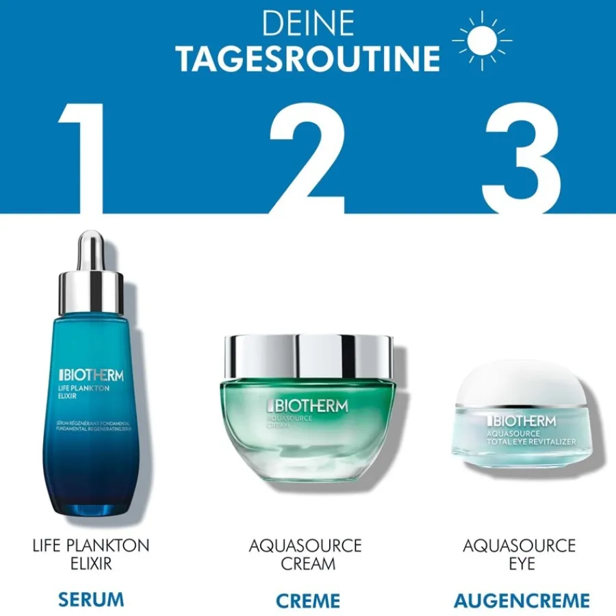Das Aquasource Total Eye Revitalizer Augengel morgens und abends im Bereich der Augenpartie auftragen und mit leicht klopfenden Bewegungen in die Haut einarbeiten und einmassieren.