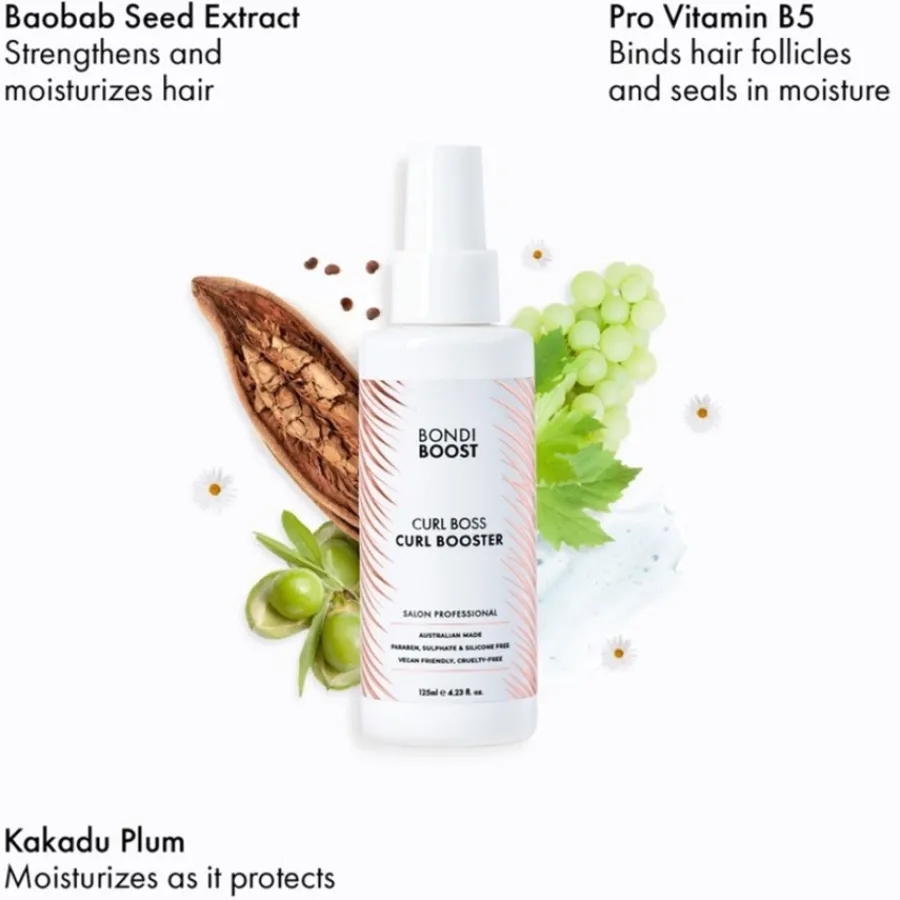 Haarstyling für lockiges Haar kann anspruchsvoll sein – mit dem BondiBoost Spray wird es zur Leichtigkeit. Speziell entwickelt, um Ihren Locken eine natürliche Sprungkraft zu verleihen, hat der Hersteller auch an die Haarpflege gedacht: Angereichert mit hochwertigen Inhaltsstoffen wie Meeresmineralien oder Algenextrakten, revitalisiert der Curl Booster Ihr Haar und definiert Locken, ohne sie zu beschweren. Außerdem spendet er intensiv Feuchtigkeit und pflegt Ihre Locken von der Wurzel an bis in die Spitzen. Ihr Haar bleibt gepflegt, wird spürbar weicher und geschmeidiger und bekommt seinen gesunden Glanz zurück.