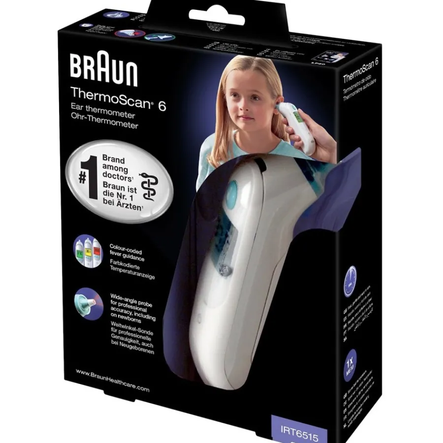 Die medizinische Fachwelt vertraut bereits lange auf die hochwertigen Geräte von BRAUN. Ob Blutdruckmessgerät oder Fieberthermometer – sie werden häufig von Ärzten angewendet und auch für den Eigengebrauch zu Hause empfohlen. Ein Ohrthermometer ist weniger invasiv und dadurch angenehmer für Kinder. Das Gerät wird für alle Altersgruppen empfohlen, einschließlich Neugeborener. Das Gerät für das Ohr liefert dabei ebenso exakte Ergebnisse wie eine rektale Messung. Dank der smarten Hintergrundbeleuchtung kann das Ohrthermometer auch im Dunkeln verwendet werden. Vertrauen Sie auf die genauen Messungen des ThermoScan 6 IRT6515.